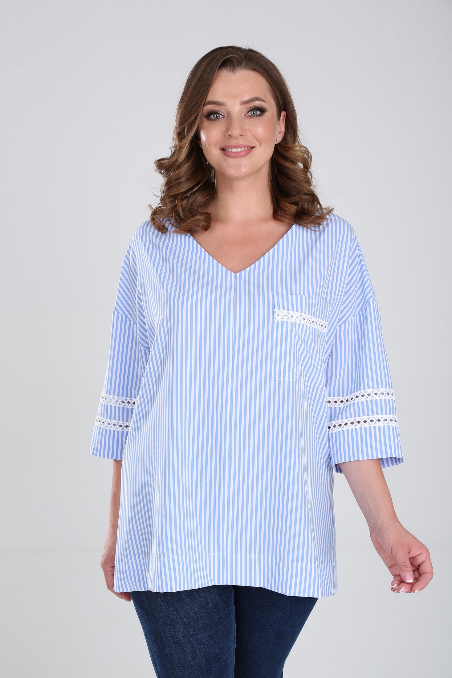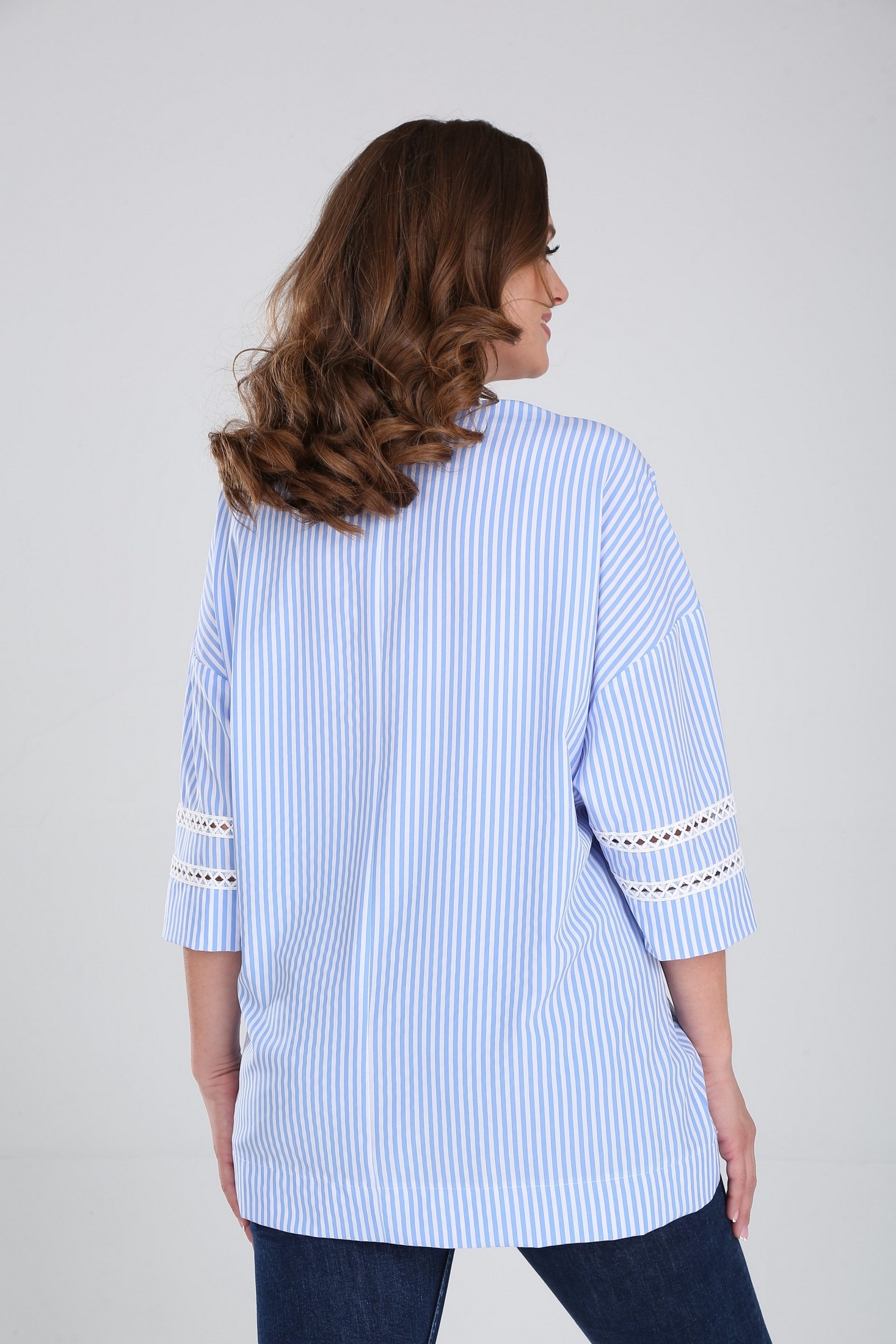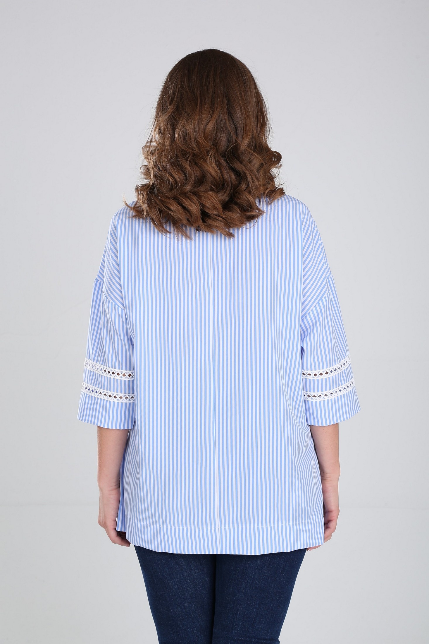 Эта стильная блузка свободного покроя представлена в приятном голубом цвете с вертикальными белыми полосами. Особенности дизайна включают V-образный вырез горловины и спущенные линии плеч, придающие изделию непринужденный и удобный вид. Рукава блузки длиннее локтя, украшены кружевной лентой, что добавляет элегантности. На левой стороне расположен накладной карман, также декорированный кружевом, создающий легкий акцент. Широкая подгибка по низу изделия завершает образ, делая его аккуратным и продуманным.