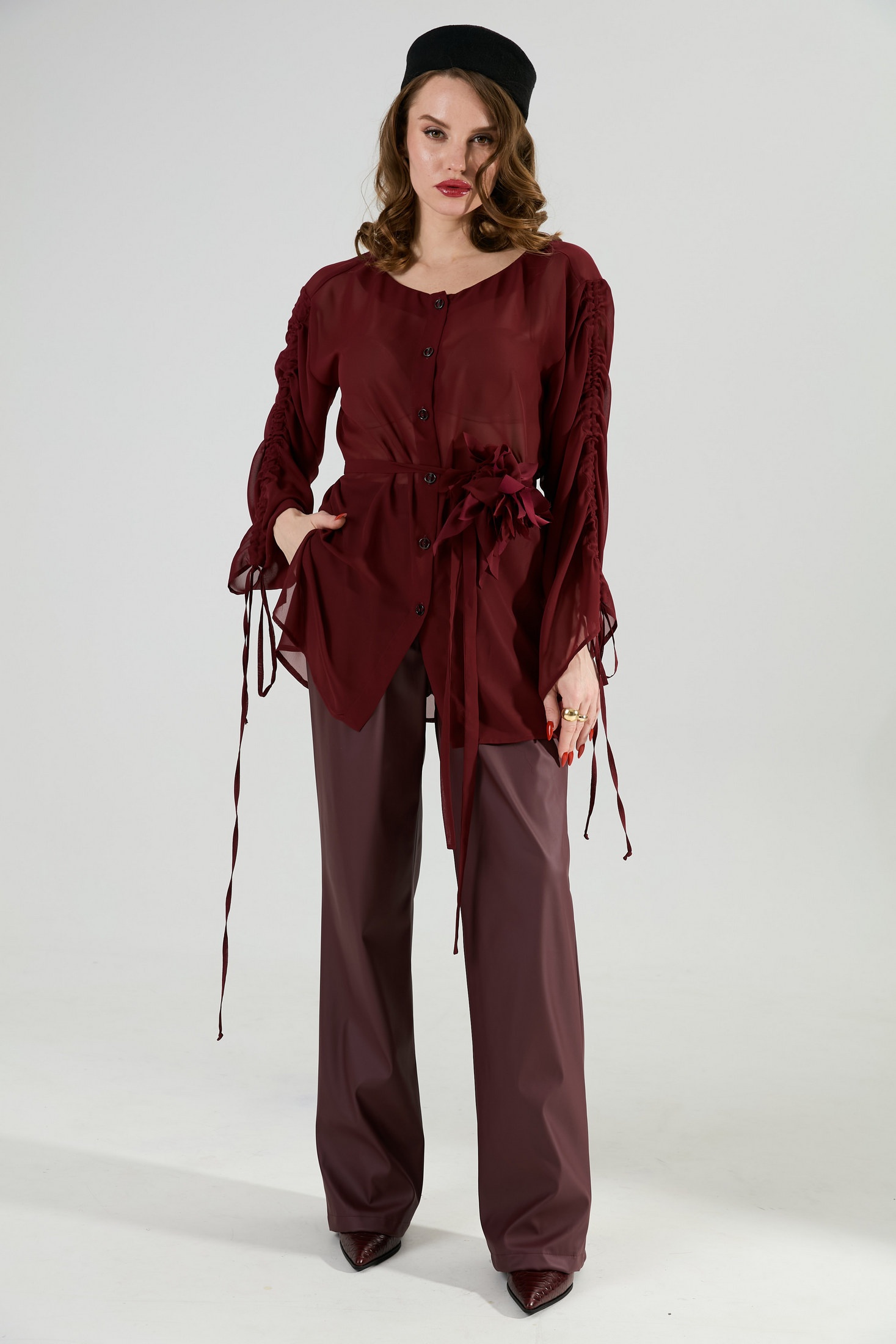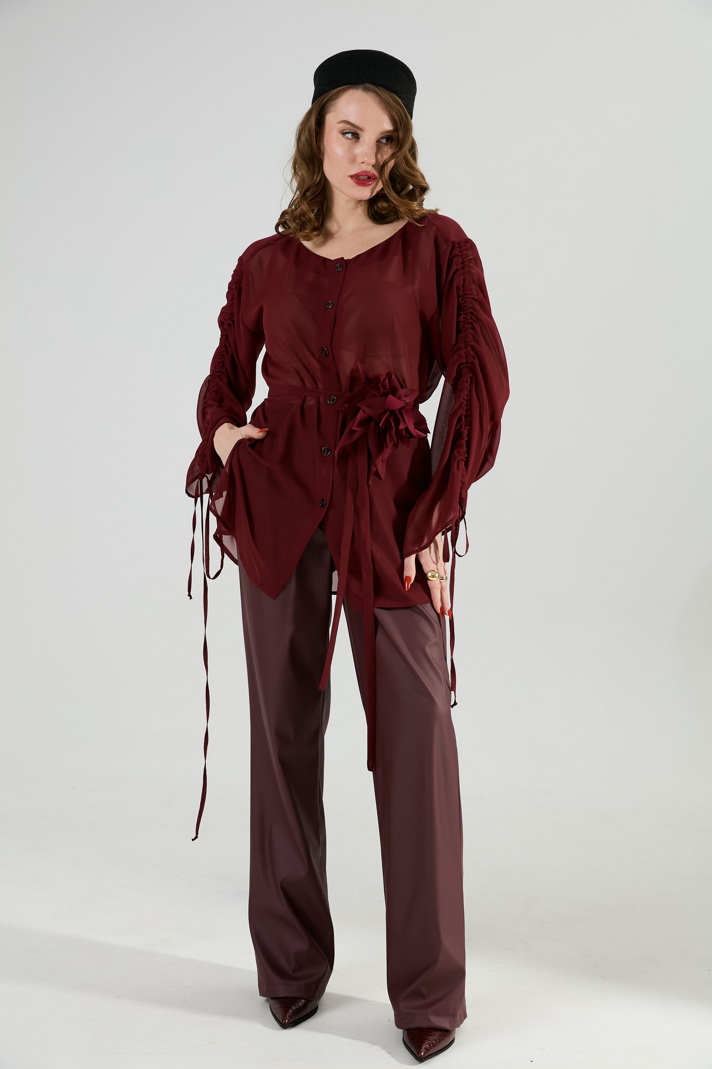 Блуза прямого кроя с центральной застёжкой на петли и пуговицы. Вырез горловины глубокий округлый. Линия плеча приспущена. На рукавах изделия заложена декоративная сборка с регулируемыми завязками (кулиса). В комплект к изделию идёт узкий пояс из основной ткани с авторским украшением ручной работы.