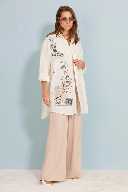 Легкая стильная блуза эксклюзивного дизайна, прямого силуэта из тонкого льна. Длина ниже линии бедра. Центральная застежка доверху на петли и пуговицы. На правой передней половинке изделия дизайнерский принт. На левой передней половинке изделия накладной карман. Спущенная линия плеча, свободный рукав, снизу на притачной широкой манжете. Спинка с отрезной кокеткой и бантовой складкой. Рубашечный воротник. Ассиметричный низ.