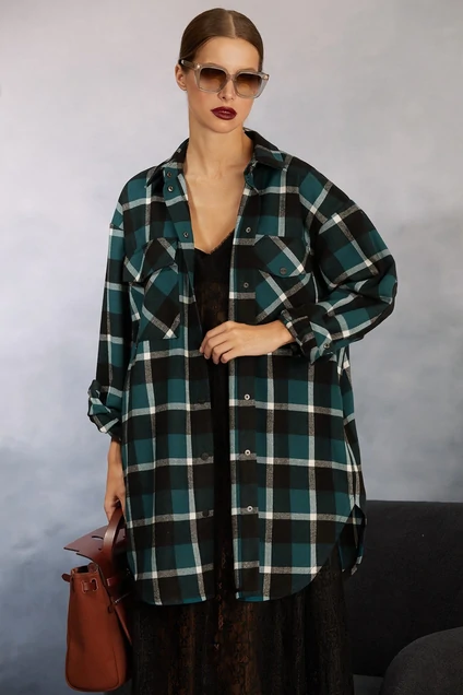 Рубашка прямого силуэта длиной ниже линии бедра, выполнена из хлопка с небольшим начесом. Центральная застежка доверху на кнопки. Накладные карманы с клапанами на передних половинках изделия. Отрезная кокетка, выполненная по косой и бантовая складка по спинке. Спущенная линия плеча, свободный рубашечный рукав со складками внизу. Рукав на притачной манжете. На рукавах расположена дизайнерская вышивка в виде сердечка с логотипом бренда.