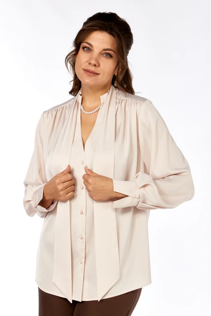 Блузка выполнена из мягкой струящейся ткани с матовым блеском. Стойка и V-образный вырез горловины. Блузка прямого силуэта, с отрезными кокетками на полочке, от которых заложена сборка, застежка на пуговицы. Разрезы по боковым швам. Рукав одношовный, с манжетой фигурной формы. Сьемное украшение выполнено из бусин, сьемное. В комплекте галстук-пояс. Длина блузки 63.5см, длина рукава 63см