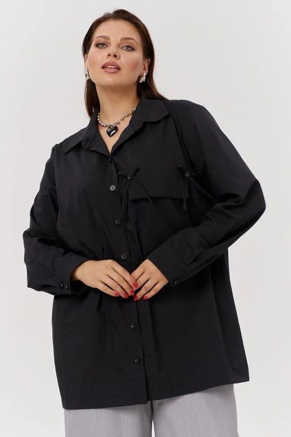 Блузка женская оверсайз типа «рубашка»– это универсальный предмет гардероба любой женщины. Блузка свободного силуэта. Воротник рубашечный отложной на стойке. Рукав втачной, одношовный, внизу на манжете, с застежкой на петлю-пуговицу. Внизу по боковым швам обработаны разрезы. Полочка с застежкой на петли-пуговицы, с накладным карманом. Оригинальным решением является завязки на кармане и контрастные пуговицы. По спинке – кокетка. Офисная рубашка считается эталоном стиля. Рубашка –это элемент одежды в любое время года и по любому случаю. Ткань не скатывается, держит форму. Благодаря удачным лекалам, рубашка займет любимое место в вашем гардеробе.