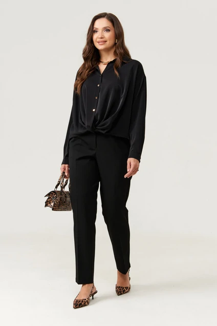 Блузка женская из струящейся ткани для повседневной носки либо для торжественных случаев. Блузка прямого силуэта. Застежка в блузке центральная бортовая на обметанные петли и пуговицы. Перед имеет декоративный узел. Спинка с отрезной кокеткой и бантовой складкой. Спинка изделия длиннее чем перед и имеет полукруглый низ. Горловина обработана воротником с отрезной стойкой. Рукава втачные длинные, низ рукава обработан притачной манжетой с застежкой на одну обметанную петлю и одну пуговицу. Очень легкая и практичная блузка, с оригинальным перекрутом. Блузка классического чёрного цвета безусловно украсит любой ваш образ и отлично подчеркнет все достоинства вашей фигуры.