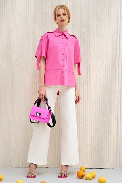 Стильная женская блуза с удлиненными нагрудными карманами станет отличной альтернативой классической рубашке в элегантных образах. Модель прямого кроя будет хорошо смотреться с классическими брюками, с прямыми и зауженными юбками, джинсами и шортами-бермудами. Блуза с коротким рукавом подойдет для офисного дресс-кода и для романтичных повседневных образов. Блуза женская будет отлично смотреться в многослойных сочетаниях с полувером или кардиганом и облегающими брюками скинни. Белая блуза гармонично сочетает в себе элементы классического стиля и casual детали. Благодаря прямому крою и широким рукавам блузка рубашка свободно садится по фигуре и оставляет полную свободу движений. В этой стильной одежде вы будете чувствовать себя максимально комфортно даже в жаркую погоду. Нарядная женская блуза с классическим воротником будет хорошо смотреться на любой фигуре. Заказать ее можно для создания образов для офиса, посещения учебного заведения, семинаров, деловых встреч или фотосессий.