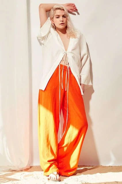 Рубашка женская из белого мягкого льна с покроем в стиле "кимоно". Горловина обработана притачной планкой, которая по спинке имеет V-образную форму. Рукава укороченные широкие. Блузка завязывается спереди на два втачных шнура по планке.