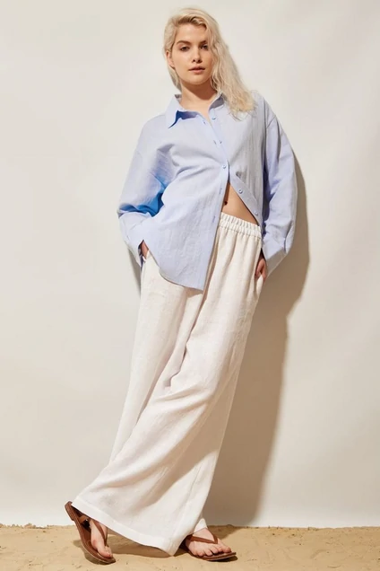 Рубашка женская из мягкого льна в стиле oversize, застегивающаяся на петли и пуговицы по планке спереди. Горловина обработана втачным воротником на стойке. Линия плеча спущена, рукава длинные с притачной манжетой и планкой по низу, застегивающиеся на петли и пуговицы. Линия низа фигурной формы.