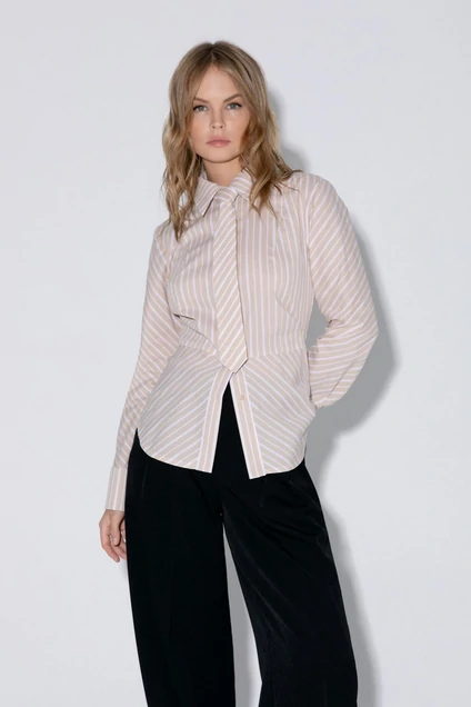 Детали: рубашечный воротник, застежка на петли и пуговицы, фигурная нагрудная вытачка-складка, втачные рукава, длинные рукава с притачными манжетами, фигурный низ, съемный галстук.