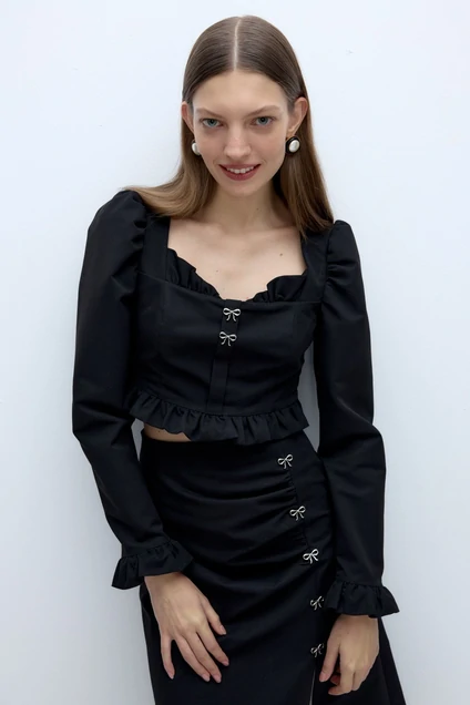 Текстильная укороченная блуза с оборками и пришивным декором в виде бантиков. Детали: блуза прилегающего силуэта, рельефы и талиевые вытачки, глубокий кареобразный вырез переда, длинные рукава с оборками, застежка на потайную молнию в боковом шве, перед блузы на подкладке 100% хлопок.