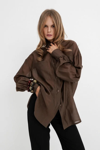 Детали: рубашка прямого силуэта, спущенная линия плеча, застежка на петли и пуговицы, длинные рукава с притачными манжетами, фигурный низ.