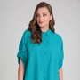 Блузка свободного кроя с центральной застежкой на петли-пуговицы. Воротник на стойке. В рукавах паты. В боковых швах разрез-шлица с декоративными пуговицами. Спинка прямая,удлиненная. Длина рукава с плечевым швом 57 см. Длина по спинке блузы 77 см.