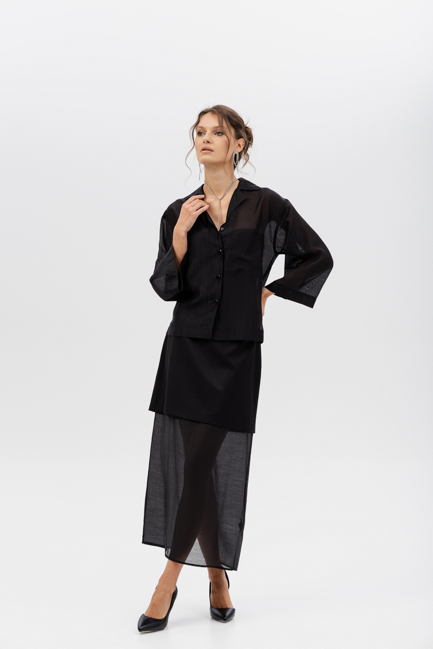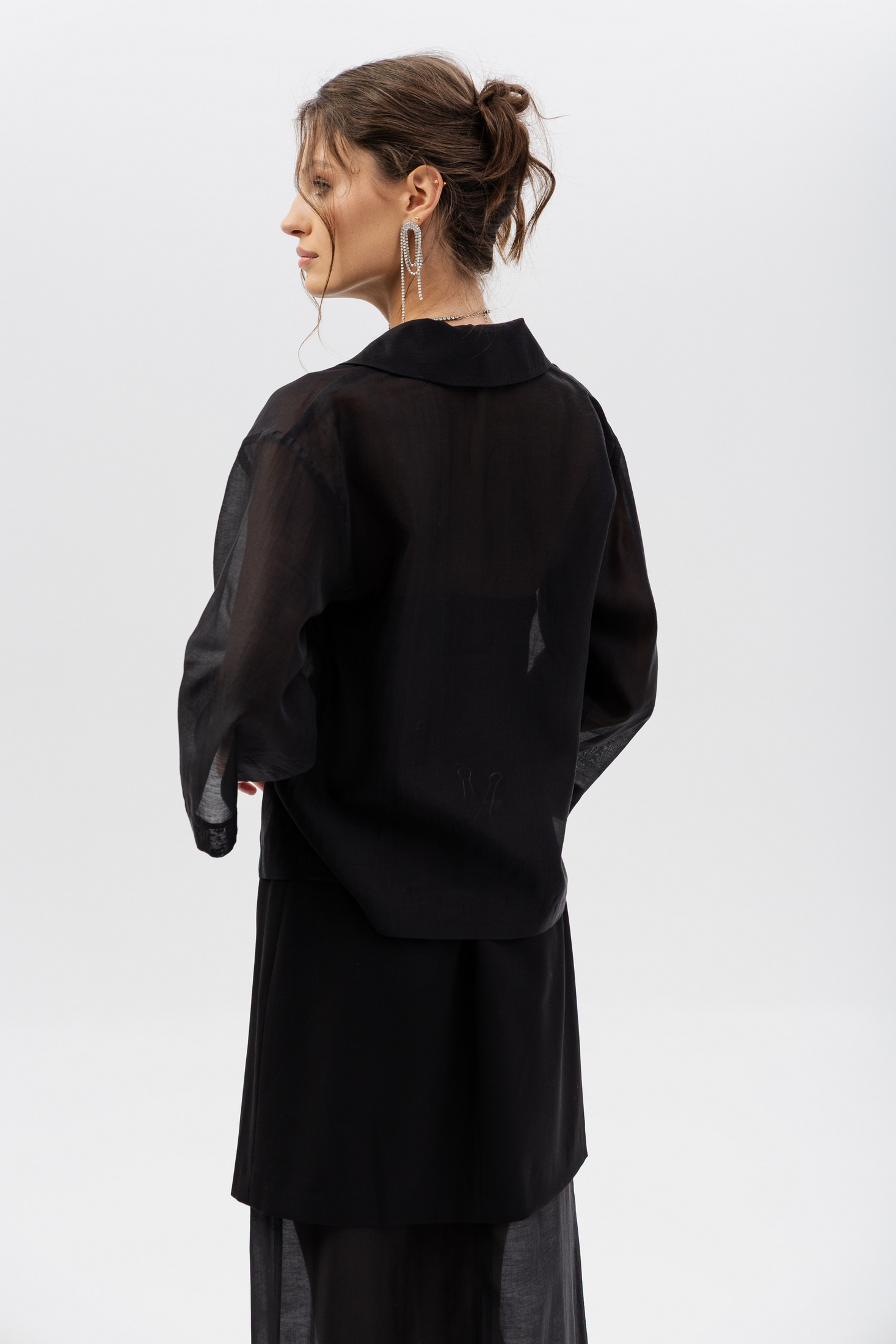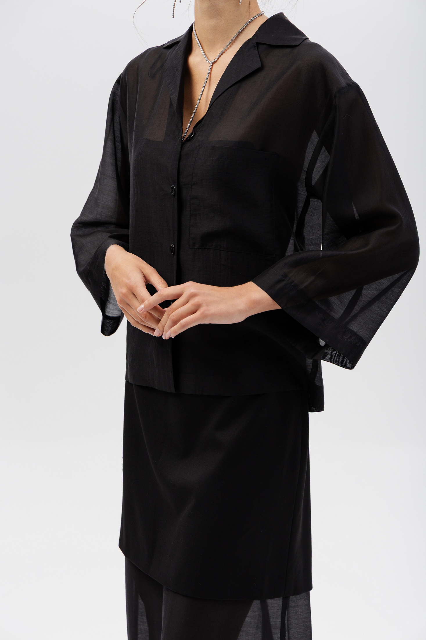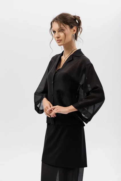 Дизайн: блуза с воротником и застёжкой на пуговицы, дополненная прозрачными рукавами из лёгкой, полупрозрачной ткани, что придаёт образу лёгкость и женственность;