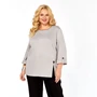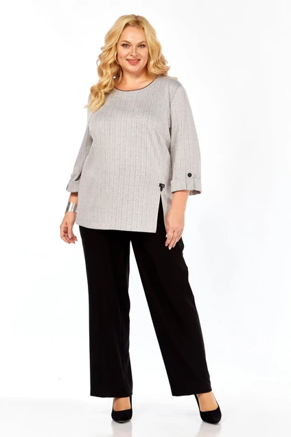 ные патой с застёжкой на пуговицу. Горловина закруглённая, на обтачке с контрастным кантиком, которая закреплена отделочной строчкой. Перед с нагрудными вытачками. С левой стороны, от вытачки вниз выполнен рельеф с разрезом внизу. Разрез декорирован пришивным элементом. Длина джемпера 70 см. Джемпер выполнен из трикотажного полотна.