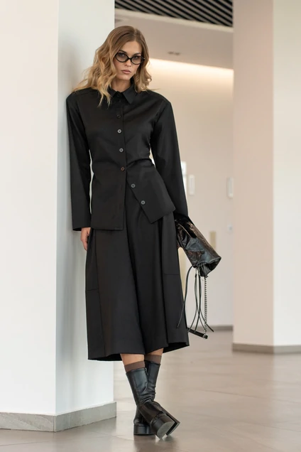 Блуза женская, актуального кроя, буквально украшает свою владелицу: деликатно расширяет плечи, акцентирует талию за счет шнуровки на спине. Рукав втачной, одношовный, с настрочной декоративной биркой. Воротник стояче-отложной с отрезной стойкой. Линия низа фигурная. Длина блузы по спинке 74 см. Длина рукава 58 см. Ширина плеча 17,5 см. Параметры в готовом виде в 44-46 р.: обхват груди 104 см, обхват бедер 110 см. ( в незатянутом шнуровкой виде ).