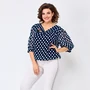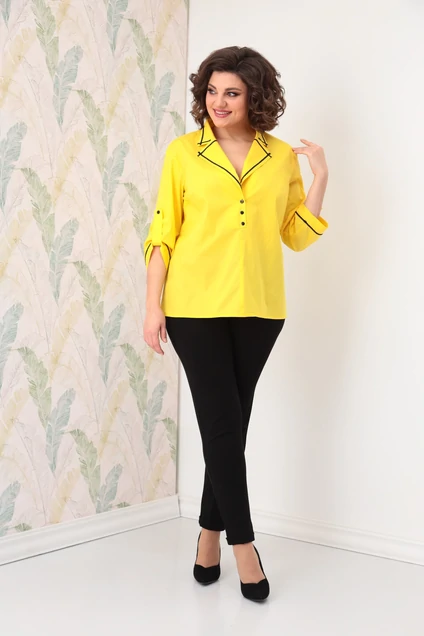 Рубашка женская полуприлегающего силуэта. По переду обработаны нагрудные выточки по центру со швом. Воротник пиджачного типа с отложными лацканами на планке и с 3 пуговицами. Рукав втачной, на пате с петлей-пуговицей. Спинка цельная. Отделкой служит настроченная тесьма по воротнику, лацканам и по низу рукавов.