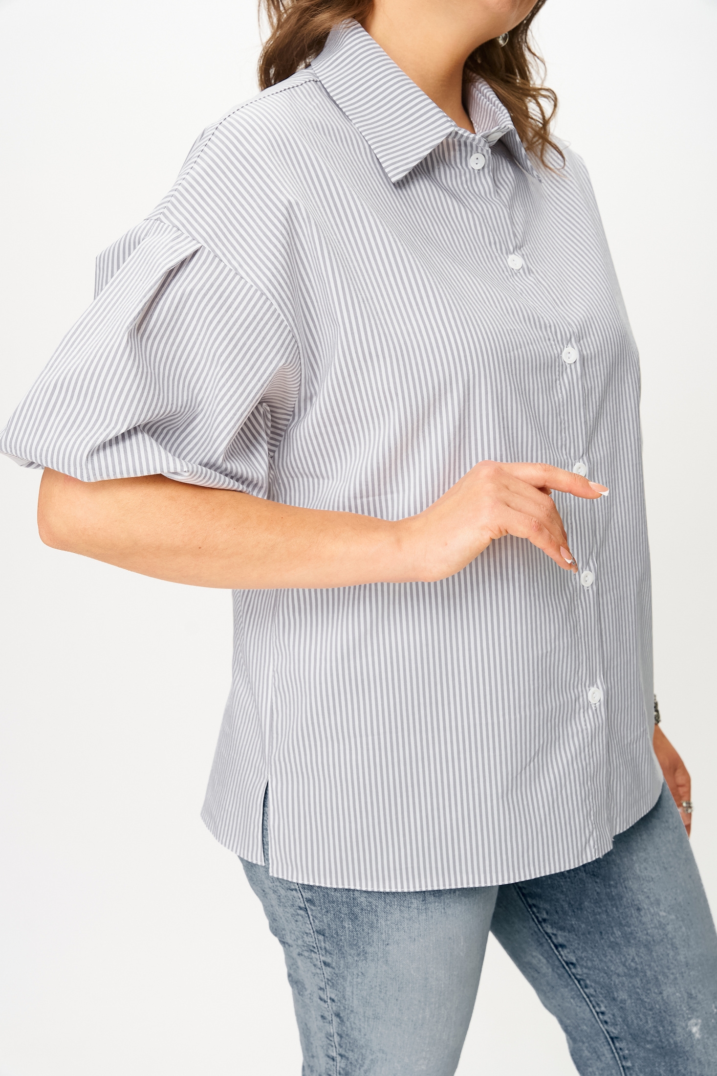 Блузка женская свободного силуэта выполнена из легкой хлопковой ткани. Линия плеча спущенная. Застежка центральная на петли и пуговицы. По горловине отложной воротник на стойке. Рукава длиной ¾ объемные к низу, добавляют романтичности и легкости. Разрезы по низу в боковых швах.