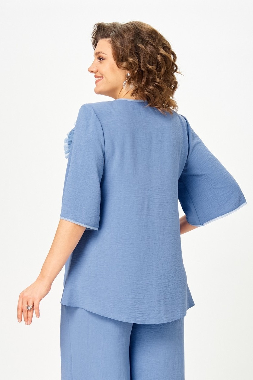 Блузка женская A-силуэта с втачным рукавом. Вырез горловины v- образной формы. Спинка цельная. Рукав длинной 7/8 расширенный к низу. Горловина и рукава по низу оформлены бейкой из отделочной ткани. Украшением служит съемный цветок.