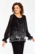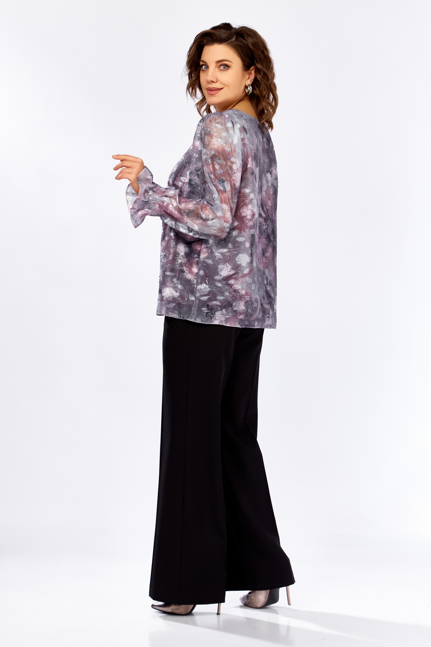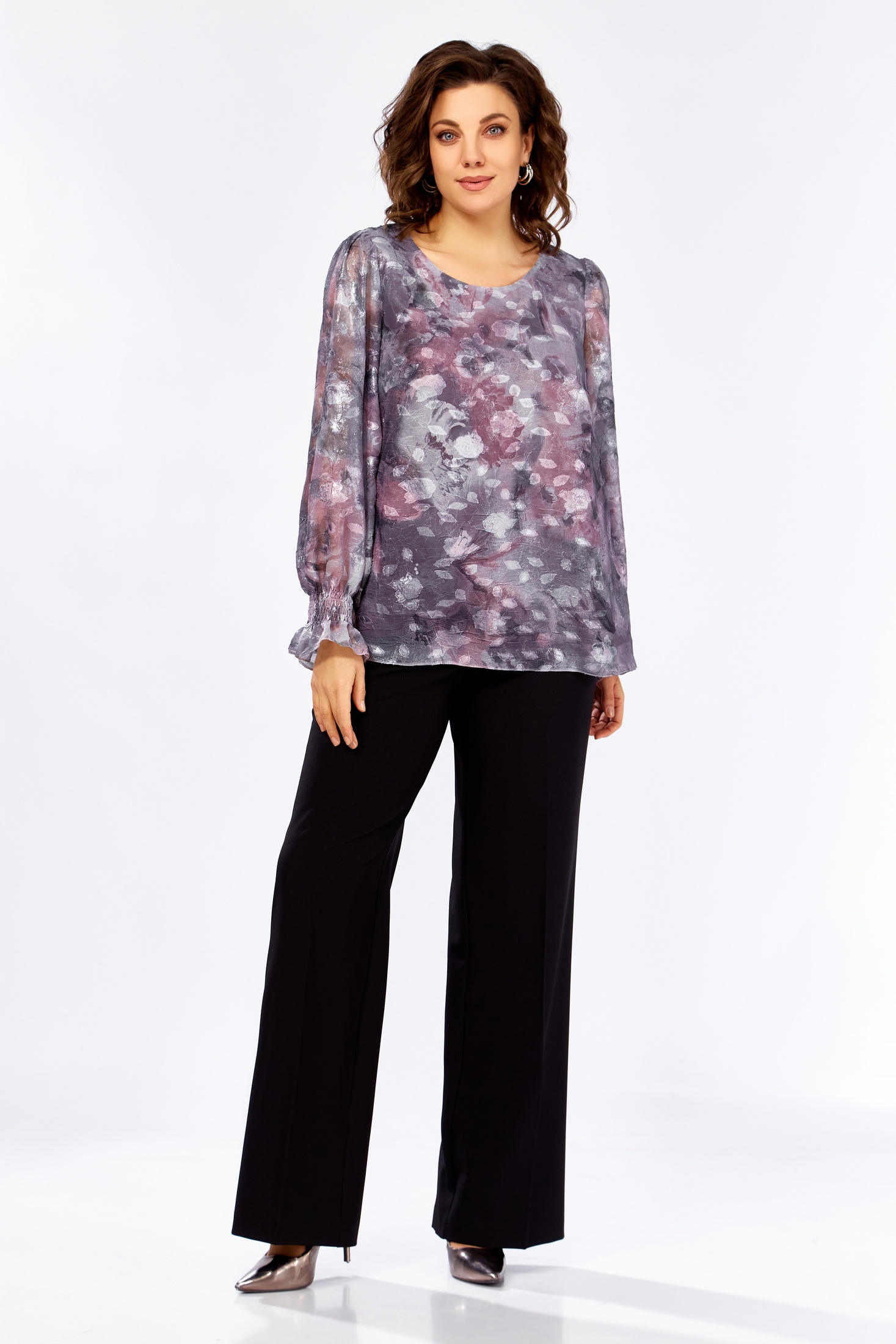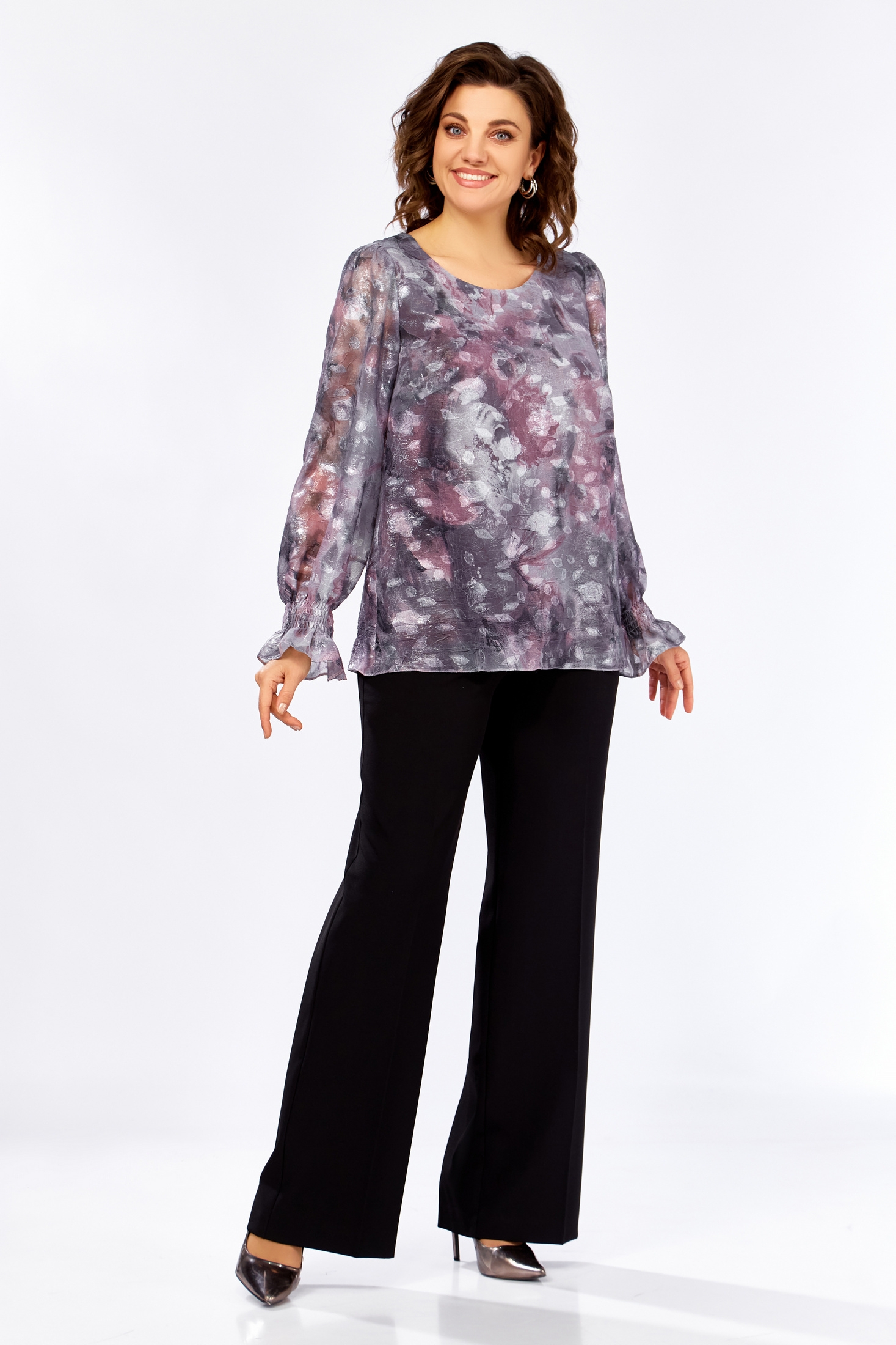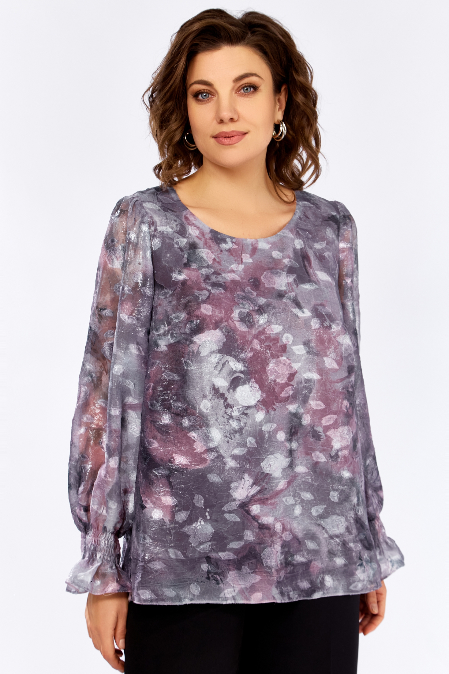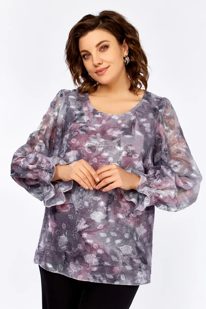 Блузка А-силуэта из нежной шифоновой ткани с лёгким эффектом «жатки», на подкладке из шифона. Полочка с нагрудными выточками, спинка без особенностей. Горловина круглая. Рукав втачной длинный по окату со сборкой, в нижней части собран на эластичную нить, которая внизу образует рюшу высотой 6 см. Длина по спинке в р.52-56 – 64 (+/-2) см? р. 58-62 – 68 (+/-2) см. Длина рукава – 64 см.