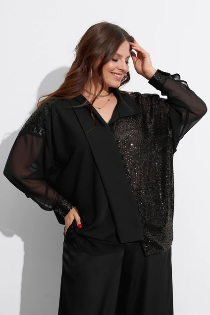 Свободная блуза с ассиметричным кроем передних деталей и воротника. Застёжка на пуговицы скрыта отворотом декоративной детали. На спинке кокетка. Рукава с манжетами на пуговицах.