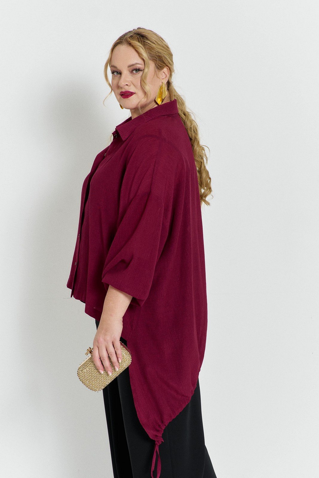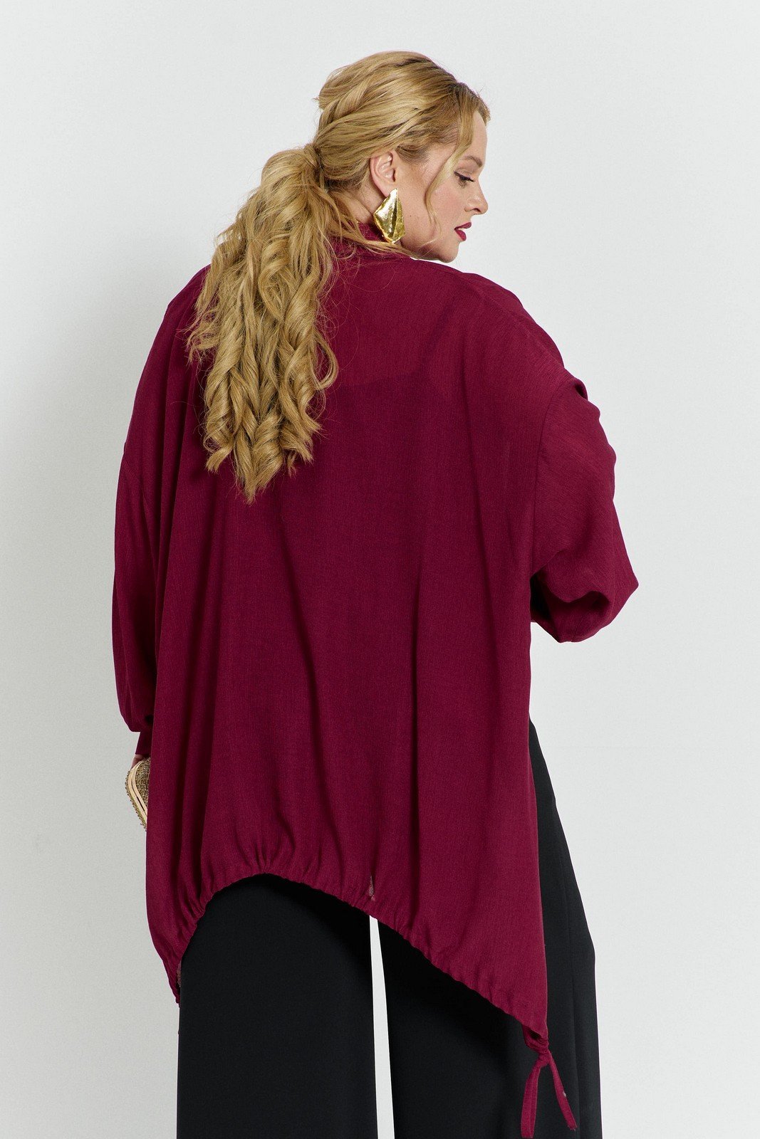 Объёмная блуза с мягкой линией плеча, рубашечным воротником на отрезной стойке, с кулисой по низу спинки. Застёжка на пуговицы, рукава на манжетах без застёжки.