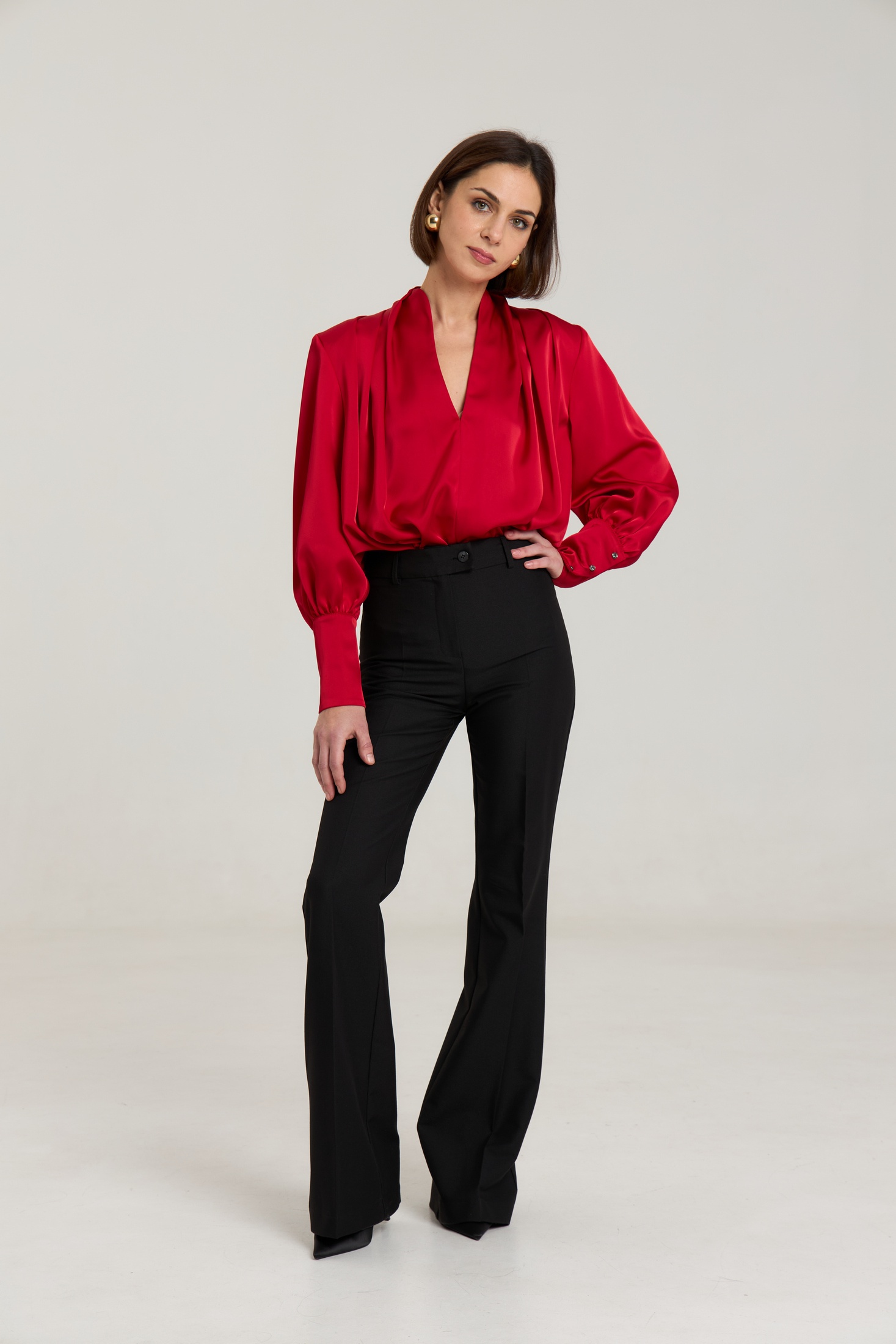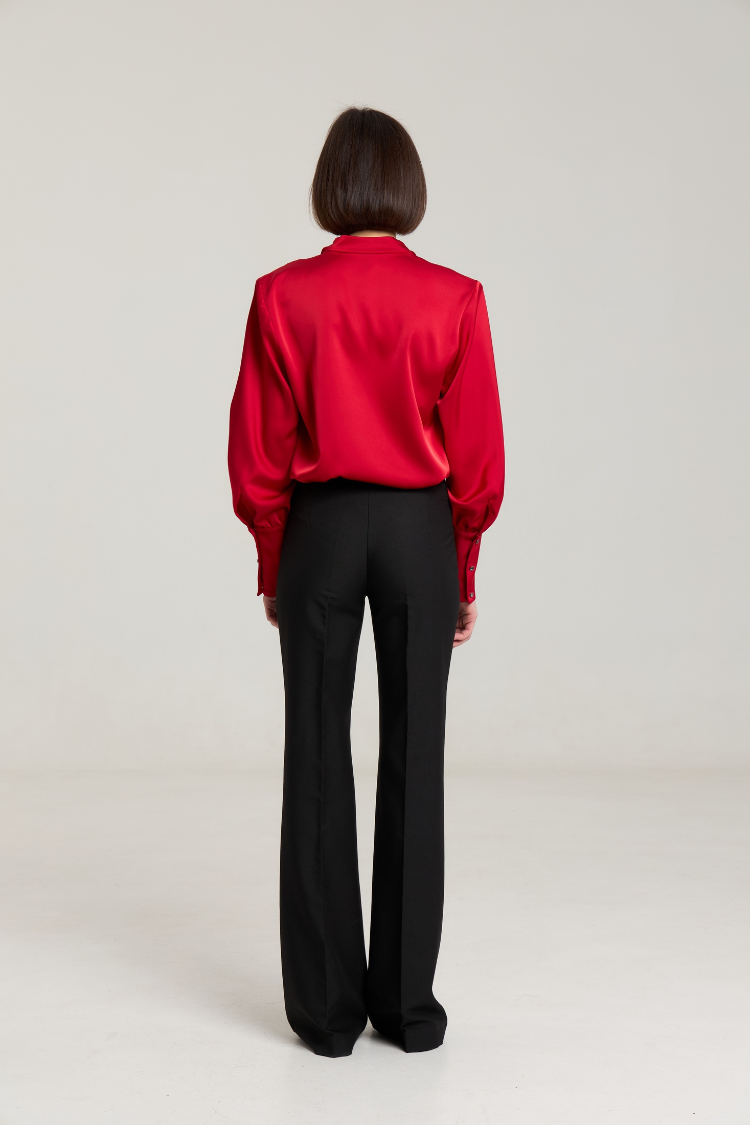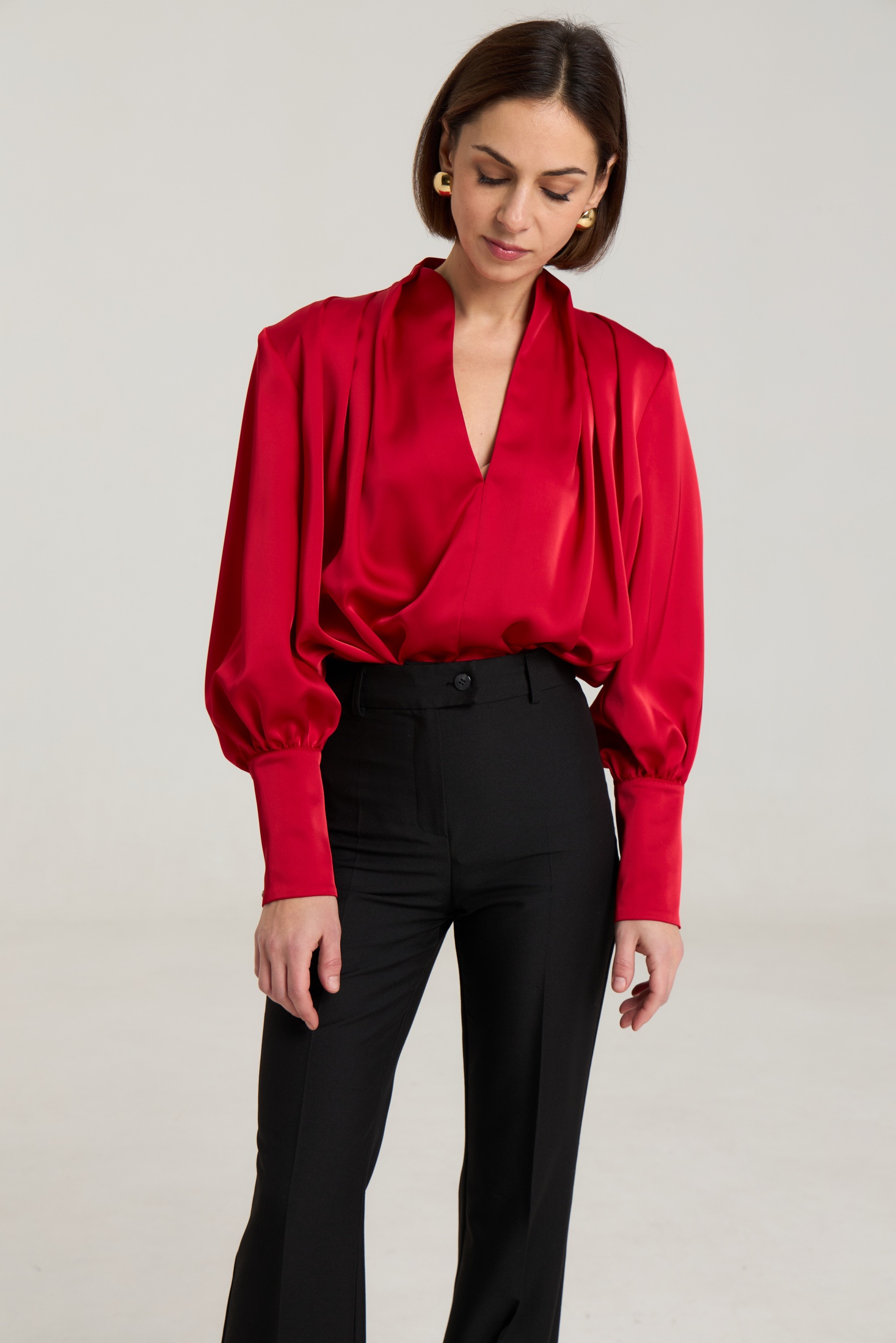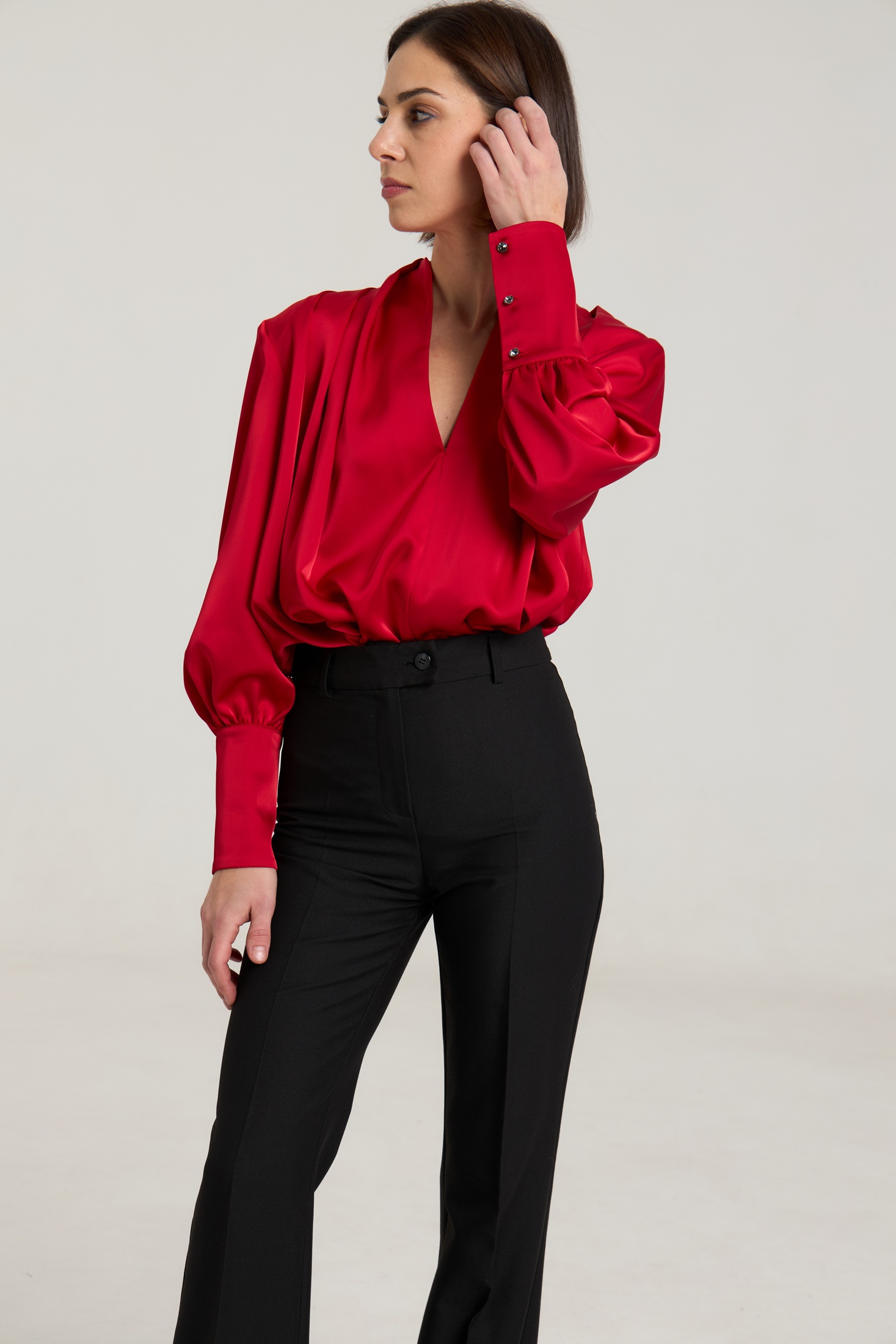 Блузка свободного силуэта, горловина V-образная, рукав притачной, линия плеча зафиксирована плечевыми вставками, манжета широкая, с застежкой на петли-пуговицы. Блуза выполнена из плотной атласной ткани красного цвета, ткань не просвечивает.