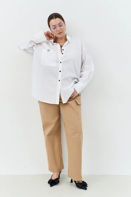 Рубашка женская в мужском стиле, из ткани с хлопком, силуэта оверсайз, спущенная линия плеча. Перед без вытачки, с нагрудным карманом с фирменным лейблом. Спинка с кокеткой и встречной складкой. Рукав одношовный на рубашечной пройме, с манжетой и отделочной планкой с затсежкой на пуговицы. Ассиметричная линия низа переда и спинки, в боковых швах отделочные детали в виде треугольника ( для удобства и эстетичного оформления разрезов). Застежка на планку с прорезными петлями и контрастнгыми пуговицами с покрытием софт тач. Длина изделия 74 см