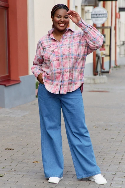 Рубашка женская в мужском стиле, из мягкой хлопковой ткани с модным потертым эффектом , силуэта оверсайз, со спущенной линией плеч. Перед без вытачки, с нагрудным карманом с контастной вышивкой названия бренда и эффектной бахромой . Спинка с кокеткой и встречной складкой. Рукав одношовный на рубашечной пройме, с манжетой и отделочной планкой с застежкой на пуговицы. Ассиметричная линия низа переда и спинки, в боковых швах отделочные детали в виде треугольника ( для удобства и эстетичного оформления разрезов). Застежка на планку с прорезными петлями и роговыми пуговицами.