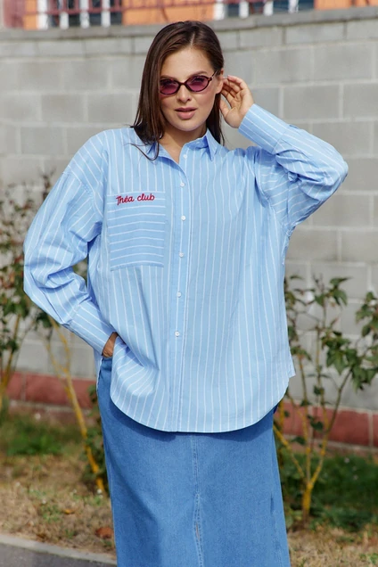 Офисная рубашка женская в мужском стиле, из хлопковой ткани в полоску, силуэта оверсайз, спущенная линия плеча. Перед без вытачки, с нагрудным карманом с контастной вышивкой названия бренда. Спинка с кокеткой и встречной складкой. Рукав одношовный на рубашечной пройме, с манжетой и отделочной планкой с застежкой на пуговицы. Ассиметричная линия низа переда и спинки, в боковых швах отделочные детали в виде треугольника ( для удобства и эстетичного оформления разрезов). Застежка на планку с прорезными петлями и контрастными пуговицами с покрытием софт тач.
