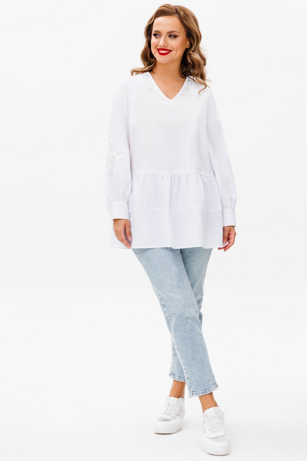 Блузка женская свободного силуэта, выполнена из блузочной ткани. Горловина переда и рукава оформлены декоративной вышивкой.