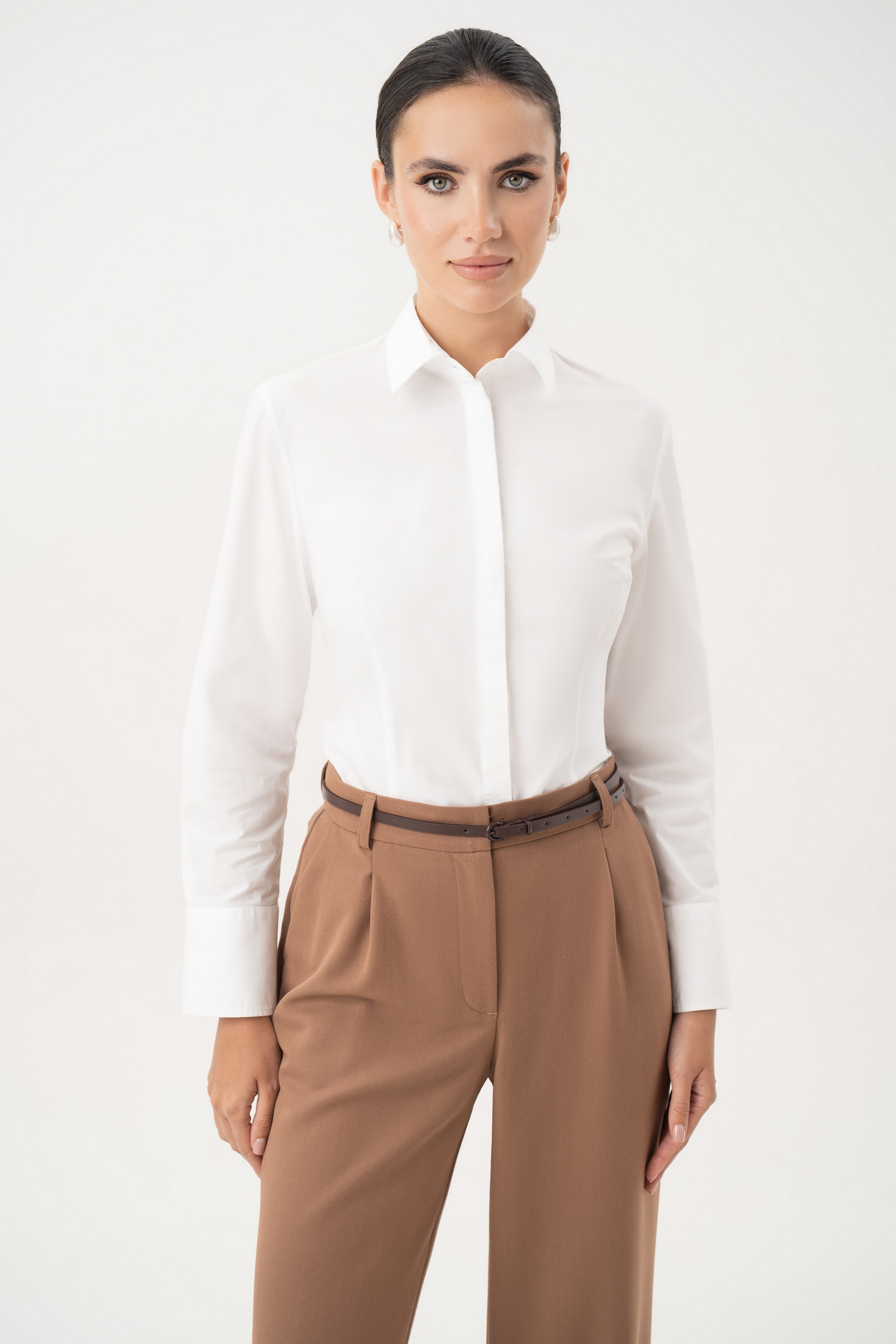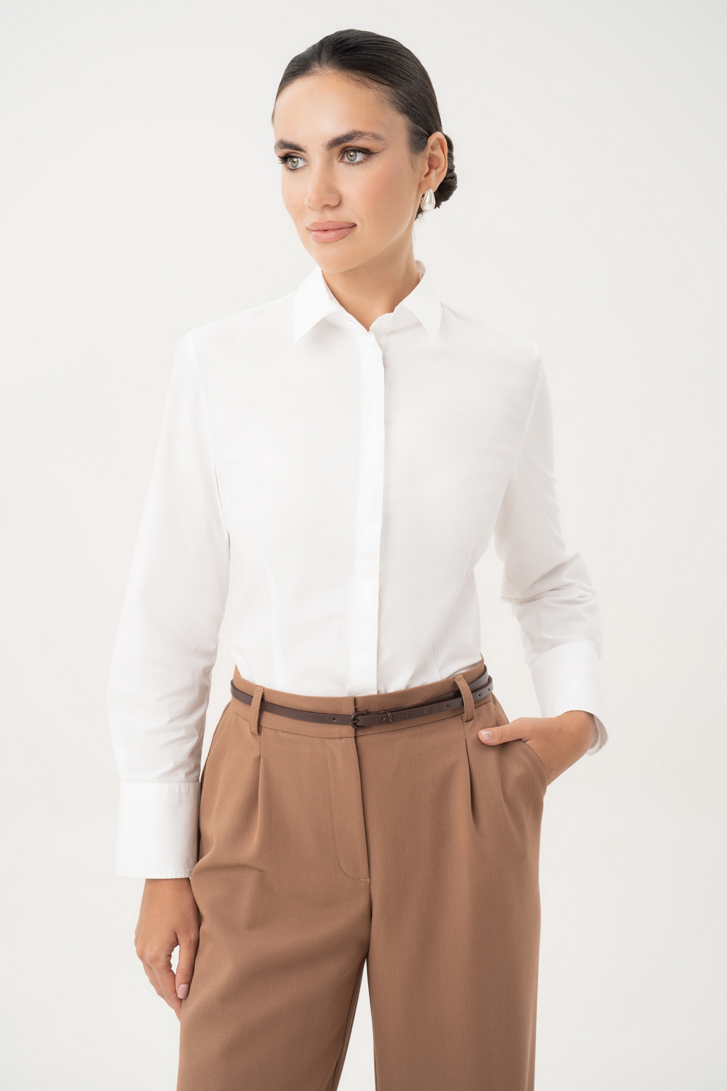 Белая рубашка женская ЮРС — воплощение классики, элегантности и уверенности в себе. Эта приталенная женская рубашка создана для тех, кто ценит деловой стиль, лаконичные линии и идеальную посадку по фигуре. Она станет основой вашего базового гардероба и незаменимым элементом образа для офиса, деловых встреч, учебы или официальных мероприятий. Блузка женская ЮРС полуприлегающего силуэта, выполнена из блузочной ткани, с центральной бортовой застежкой на потайную планку, застегивающуюся на 7 петель и пуговиц (размер и цвет фурнитуры может незначительно отличаться от фото).