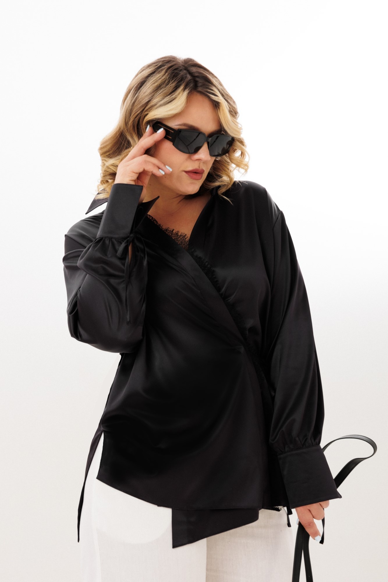 Блузка 1342 Anastasia — стильное решение для создания офисного образа. Коллекция бренда Анастасия предлагает женскую блузку с спущенным плечом из атласной ткани, обеспечивающей комфорт и стиль в любое время года. Прямой силуэт и уникальные детали, такие как разрезы по бокам и завязки на рукавах, придают изделию оригинальность. Кружевная отделка и запах добавляют женственности, а воротник на стойке подчеркивает элегантность. Эта черная блузка станет универсальной частью вашего гардероба, подходящей как для работы, так и для праздничных мероприятий. Длина по спинке составляет 76 см для размеров 50-54 и 79 см для 56-60. Блузка идеально подходит для высоких и невысоких женщин, делая её любимой вещью на каждый день.