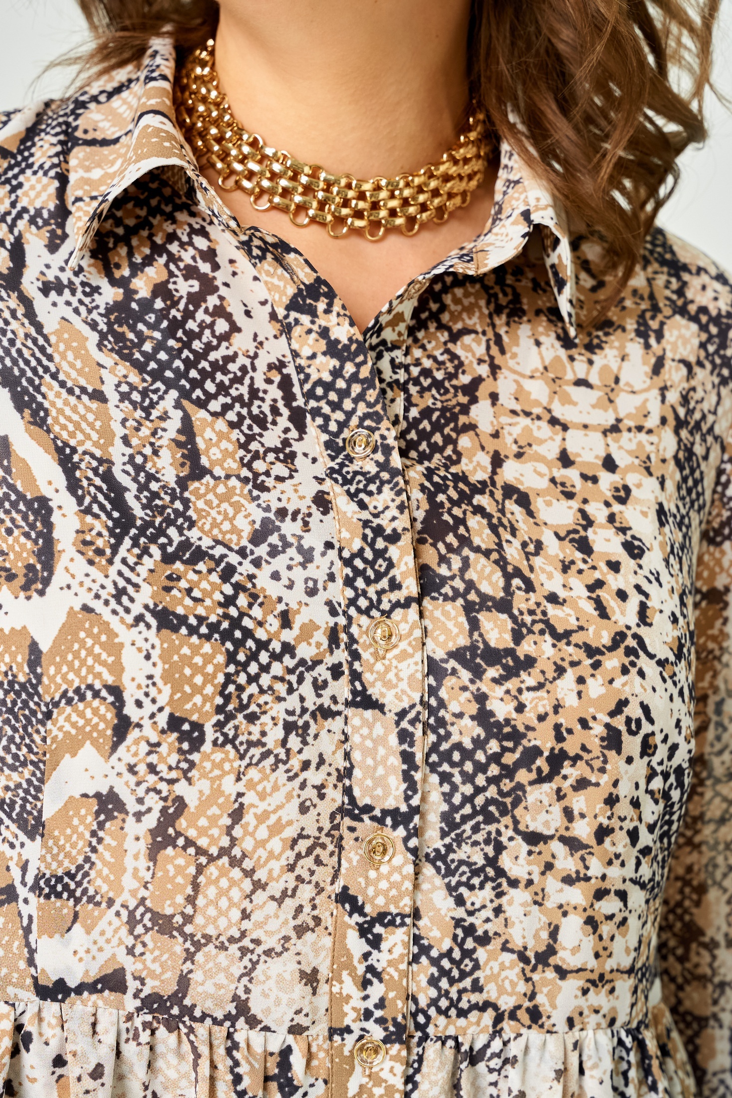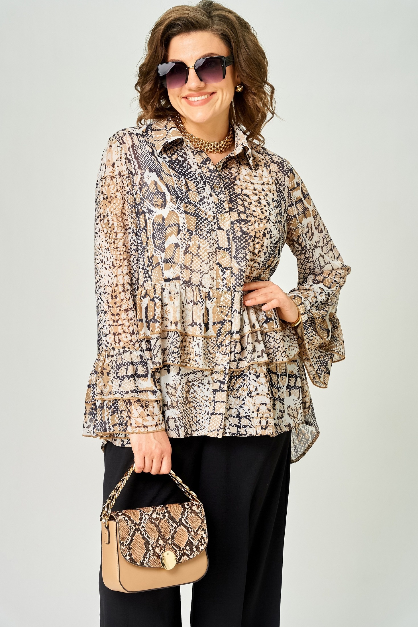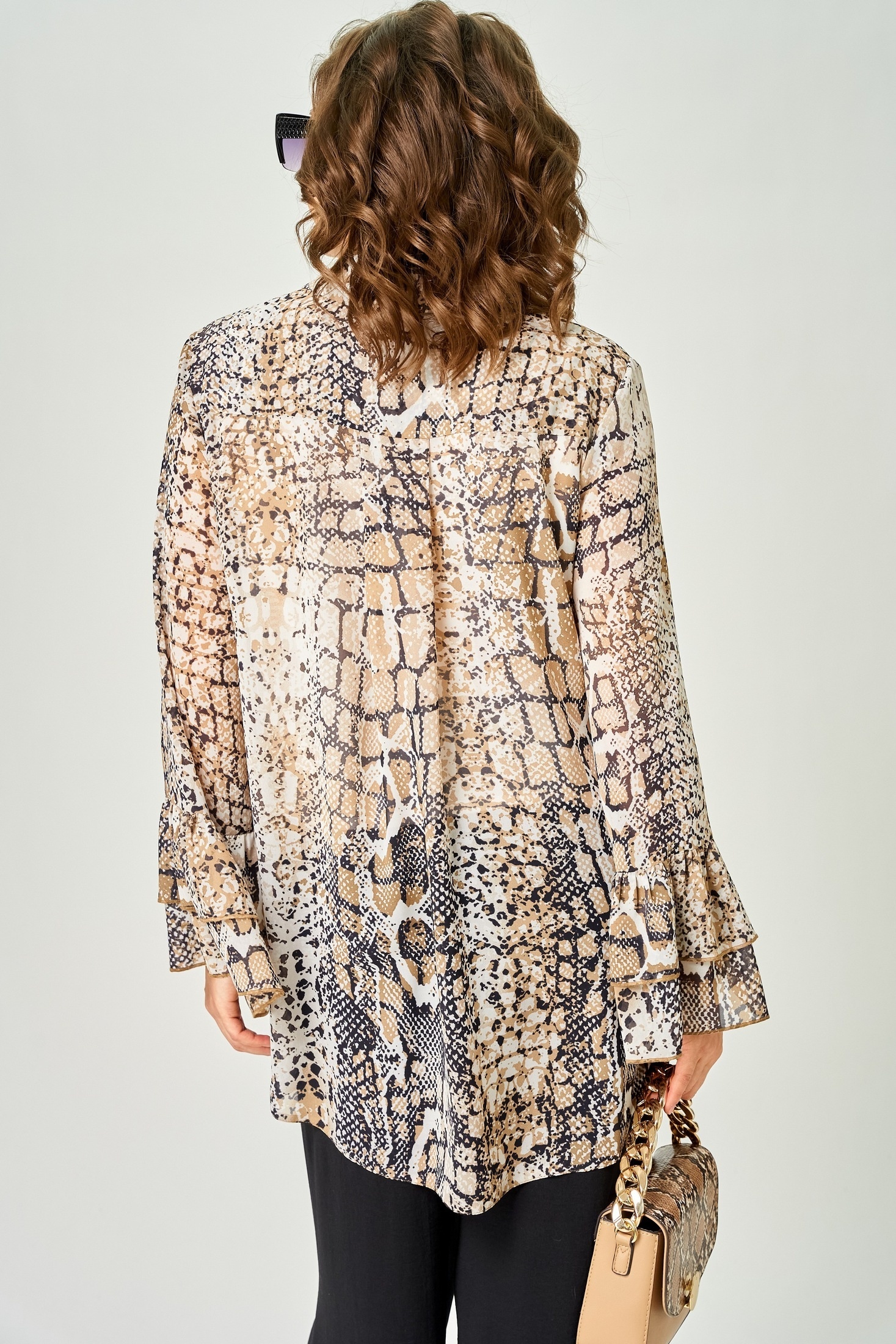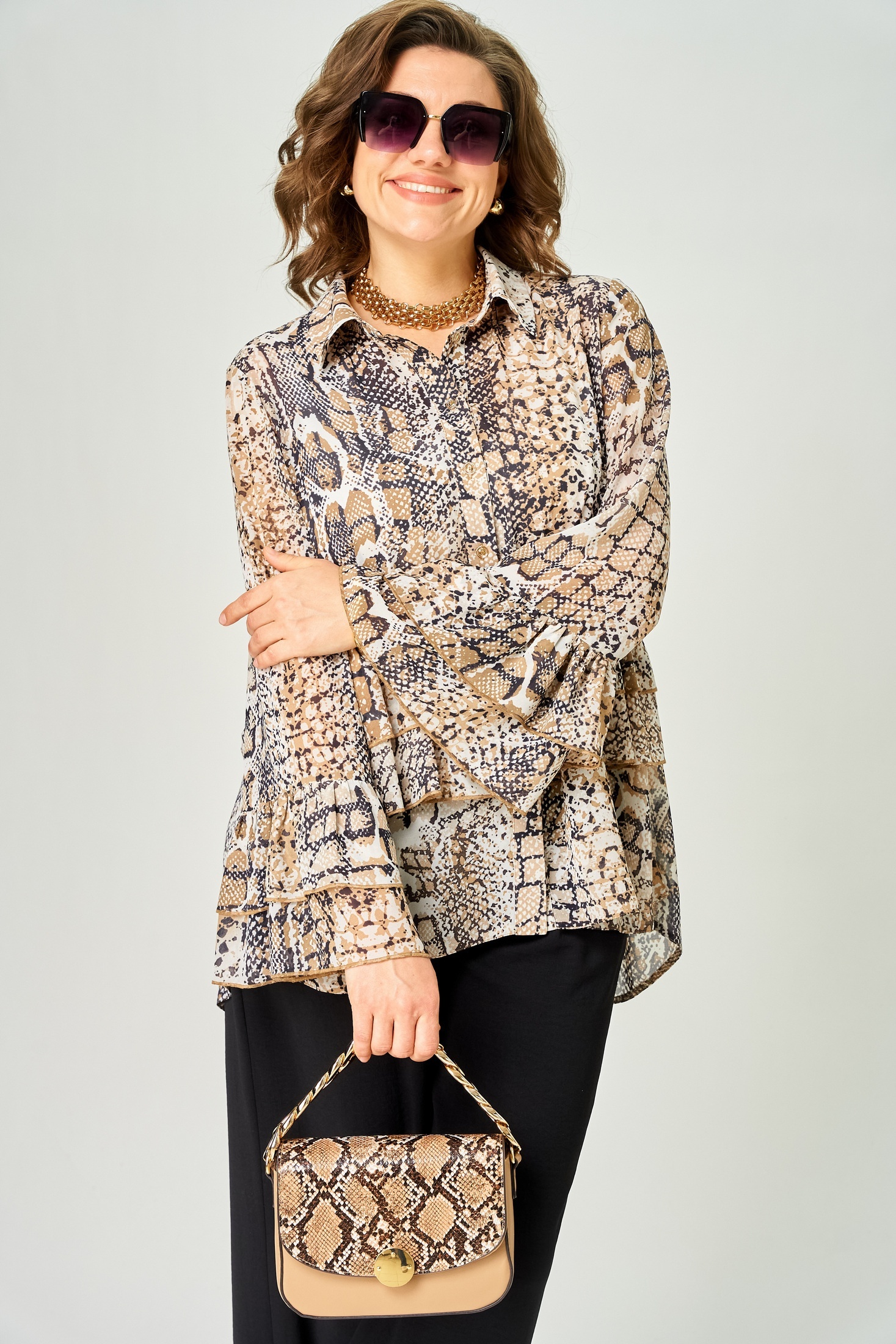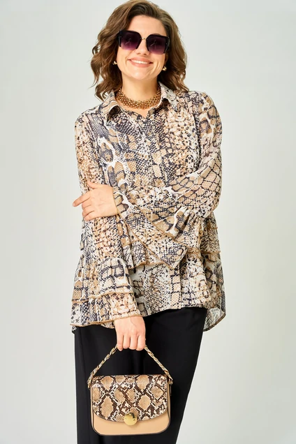 Блузка 7221 принт питон EVA GRANT представляет собой уникальное сочетание стиля и комфорта. Коллекция бренда EVA GRANT предлагает эту блузу из легкого шифона с актуальным принтом питона. Полуприлегающий силуэт и фигурный низ придают изделию женственность и шарм. Модель оснащена воротником стойка и оригинальными воланами по низу рукава, что обеспечивает легкость и воздушность. Застежка на пуговицы по всей длине добавляет практичности. Шифон в тандеме с полиэстером, вискозой и спандексом делает блузу прочной и комфортной в носке. Идеально подходит для весенних и летних будней, подчеркивая современный повседневный стиль. Сочетание белого, коричневого и черного цветов позволяет легко создавать стильные образы.