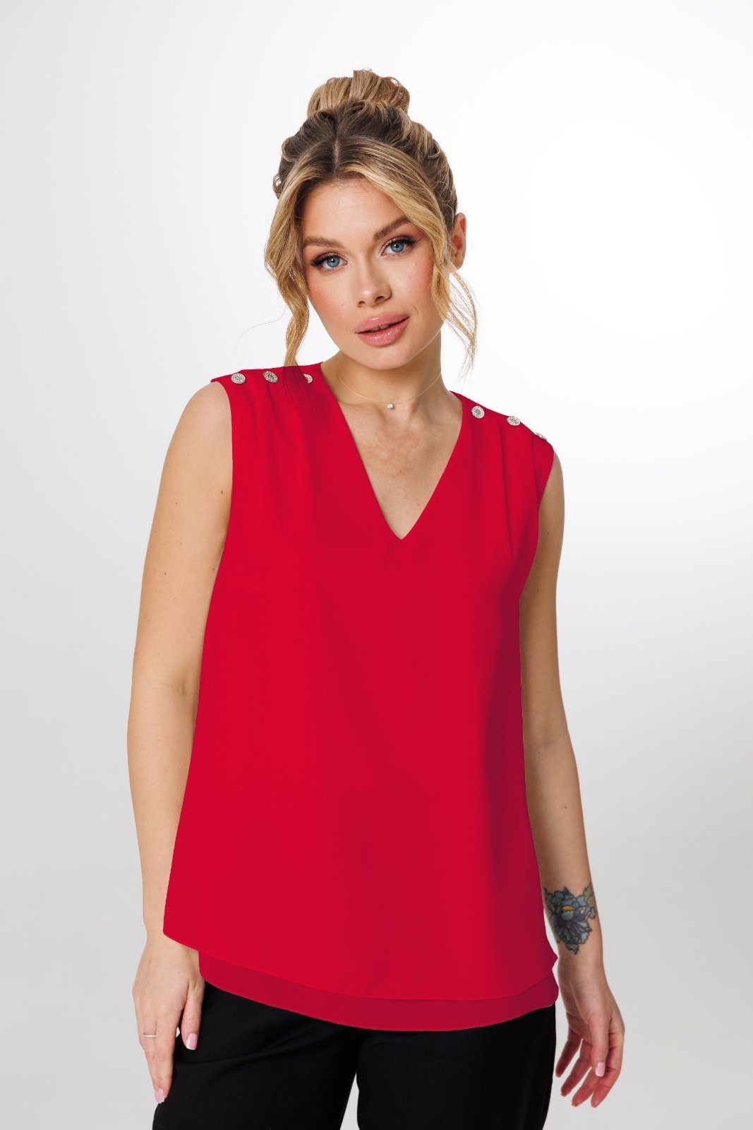 Блузка 1736 красный Faufilure сочетает в себе изысканный стиль и комфорт. Коллекция бренда Faufilure предлагает вам блузку из легкого шифона, идеально подходящую для теплых летних дней. Свободный силуэт изделия обеспечивает легкость и свободу движений, а V-образный вырез и декоративные пуговицы по плечевой линии добавляют оригинальности. Яркий красный цвет делает эту блузку центральным элементом вашего гардероба, а полиэстер гарантирует долговечность и легкость в уходе. Идеально подходит как для повседневного, так и для офисного стиля.