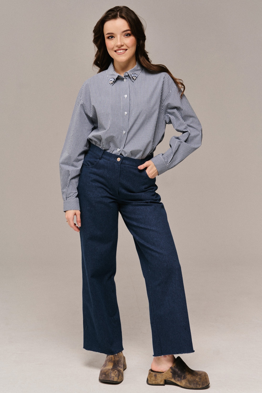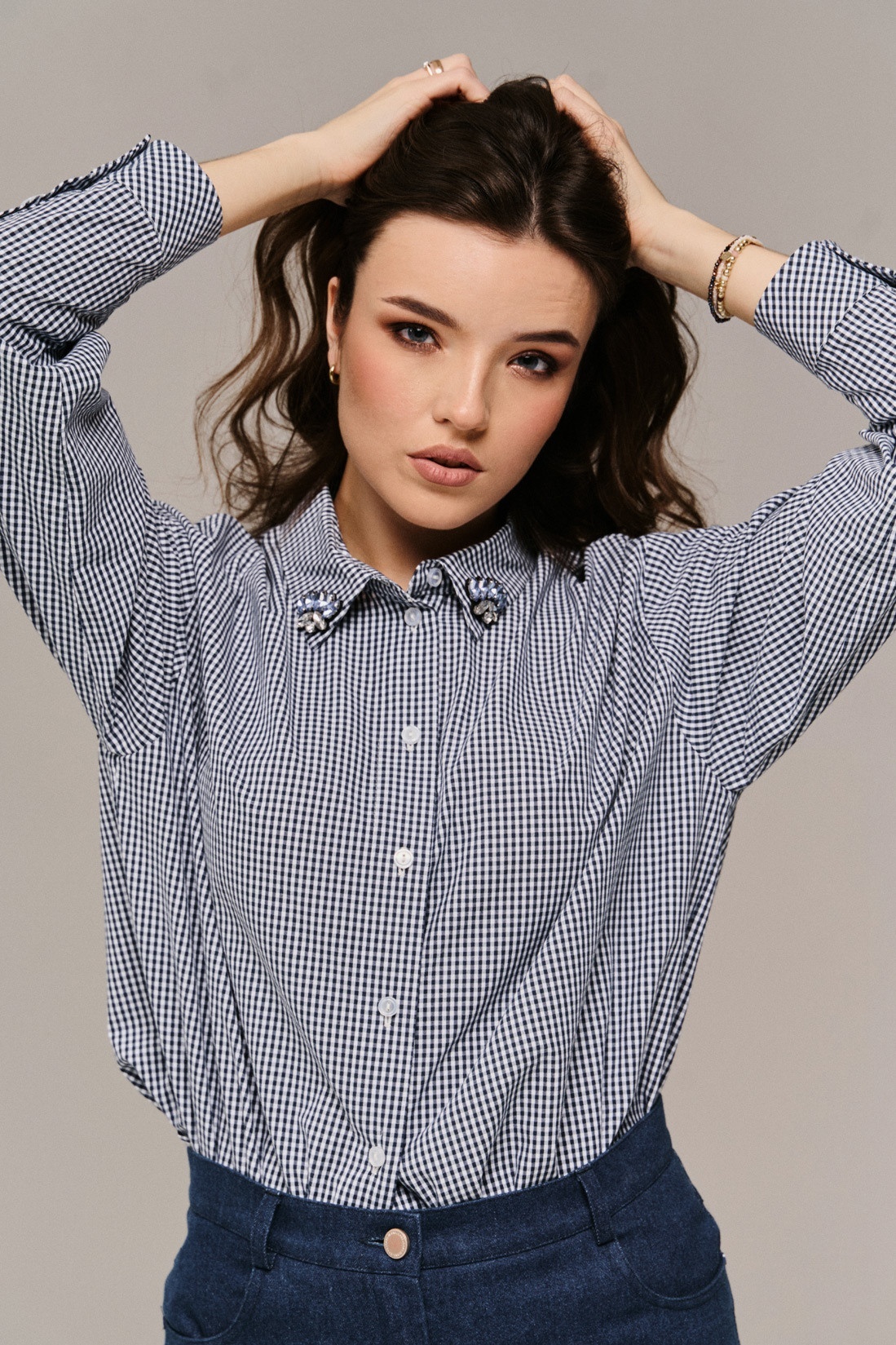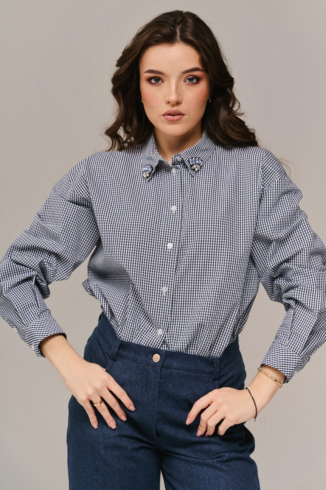 Блузка 2671 JRSy от бренда JRS представляет собой стильное решение для вашего гардероба. Коллекция бренда JRS предлагает молодежный прямой силуэт с объемной спущенной линией плеча. Этот наряд выполнен из 100% хлопка, что делает его мягким и дышащим. Блузка имеет мелкую клетку, добавляющую ретро-шарм, и декорированную аппликацию на воротнике, что придает изюминку. Рукава до запястья с манжетами на две пуговицы делают образ завершенным. Спинка с низкой кокеткой и бантовой складкой добавляет изысканности. Идеальный выбор для весенне-летнего сезона в стиле casual, она будет идеальным дополнением к вашему повседневному образу. Основной цвет модели — черно-белый, что делает её универсальной для любой комбинации.