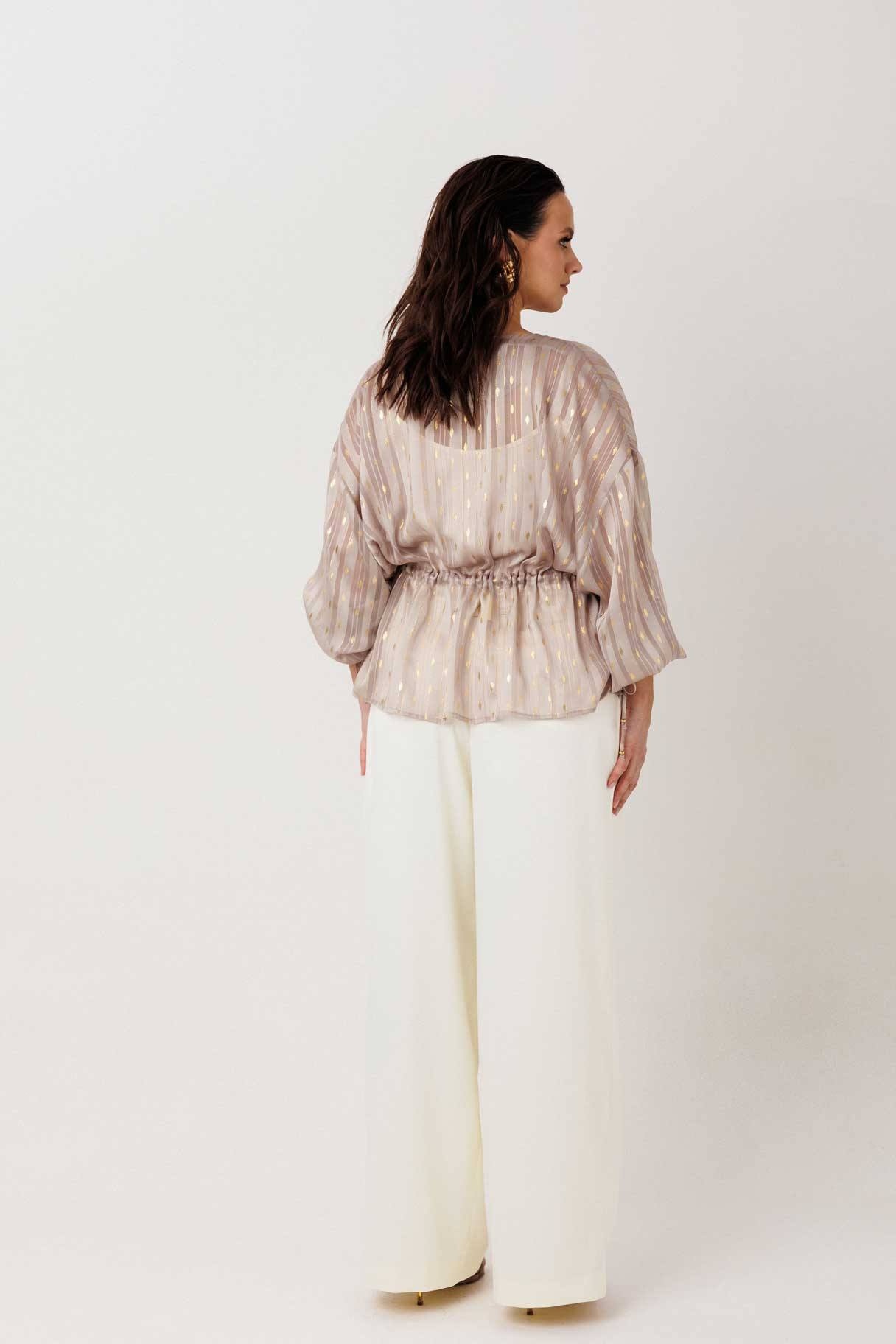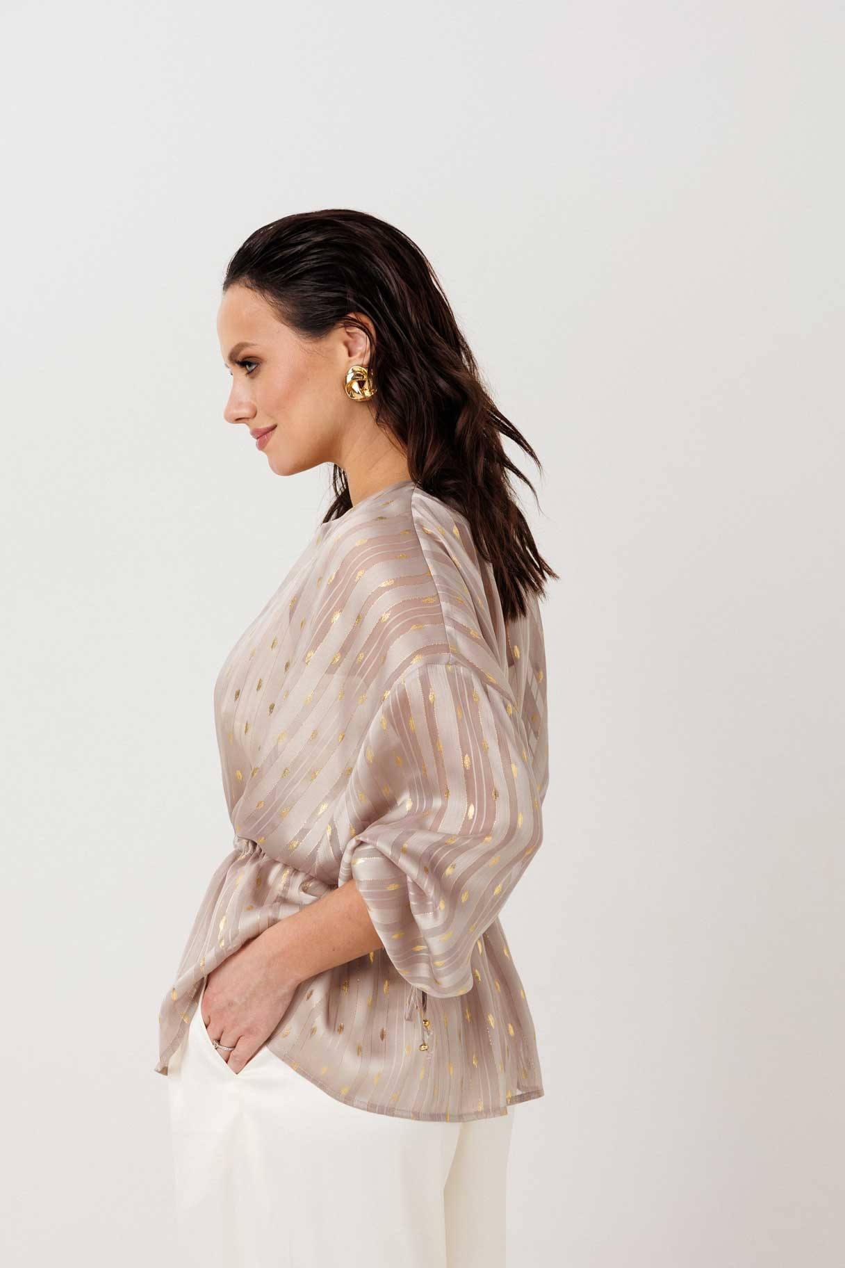 Блузка 1300 золотой MisLana очаровывает своим утонченным дизайном и уникальной атмосферой. Коллекция бренда MisLana предлагает воздушные блузы, которые легко создают незабываемый стиль. Эта модель выполнена из легкого материала с тонким блеском, что добавляет ей нарядности. Изделие без застежки, с регулируемой талией благодаря кулиске, что позволяет идеально подчеркнуть силуэт или выбрать свободную посадку. Объёмные рукава придают современное звучание и эффект легкости. Золотистый цвет обволакивает тёплым сиянием, подходя для летних часов и нежных прогулок. Эта блузка станет вашим идеальным выбором для уютных летних дней и стильных вечеров.