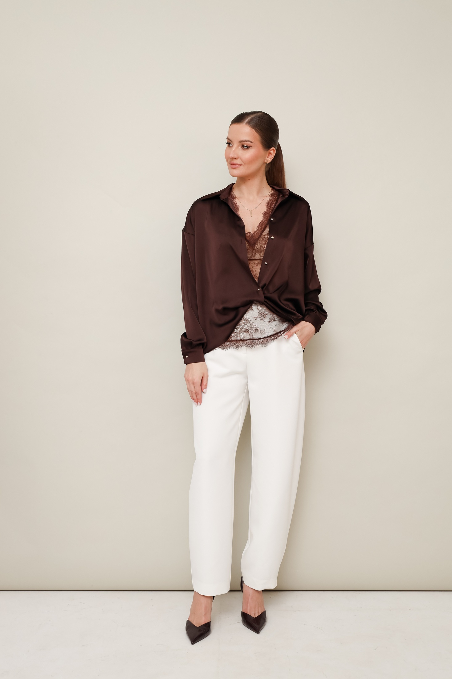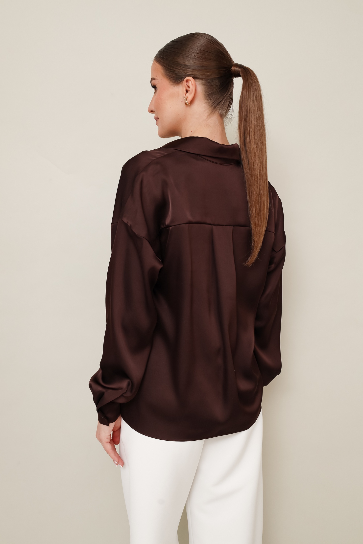 Блузка 11-454 Pur Pur — это изысканное дополнение к вашему гардеробу. Коллекция бренда Pur Pur предлагает блузку из полиэстера с благородным матовым блеском, которая идеально сочетается с деловым и повседневным стилем. Модель с рубашечным воротником, центральной застежкой на пуговицы и декоративным перекрутом внизу придает образу особую утонченность. Спущенная линия плеча и манжеты с пуговицами подчеркивают современный силуэт. Блузка декорирована бантовой складкой на спине. Подходит для осени и весны, она станет идеальной основой для офисного и вечернего ансамбля. Цвет — глубокий коричневый, что придает изделию универсальность.