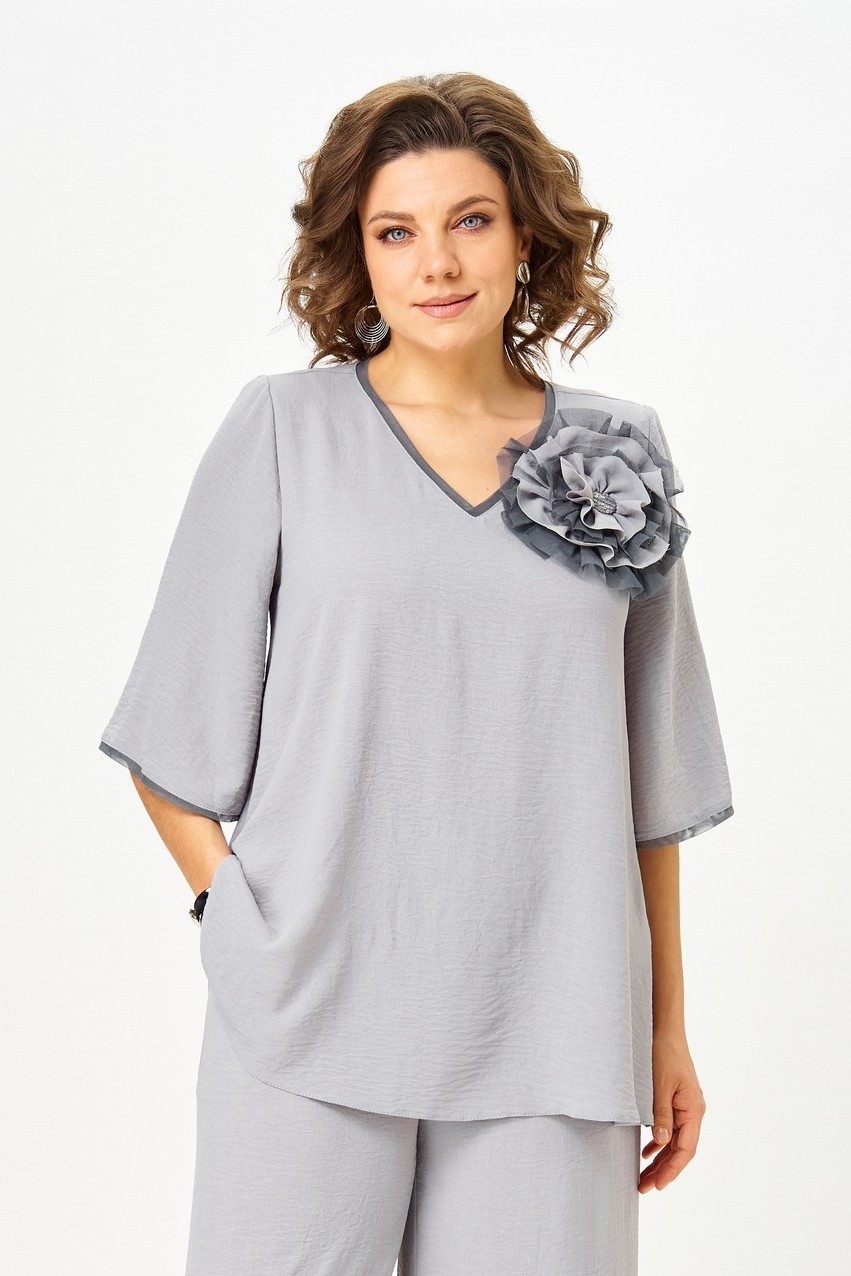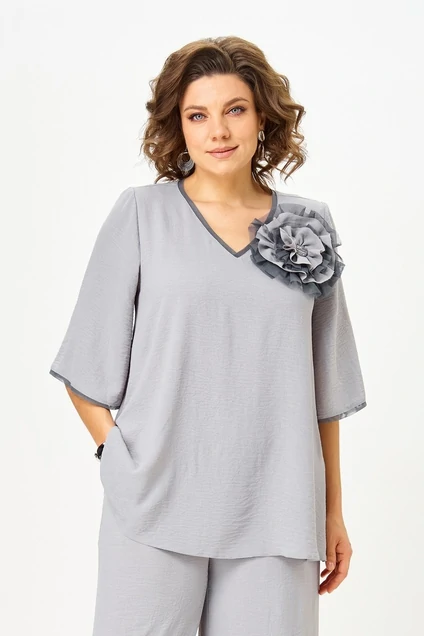 Блузка 3025 серый Svetlana Style — стильный элемент вашего гардероба. Коллекция бренда Svetlana Style предлагает женскую A-силуэт блузку из 65% полиэстера, 32% вискозы и 3% спандекса. Этот материал обеспечивает комфорт и легкость, идеально подходящий для нежаркой погоды. Оригинальный дизайн с v-образным вырезом и длинным рукавом 7/8, расширенным к низу, украшенный съемным цветком, подойдет как для офисного стиля, так и для вечерних прогулок. Приятный серый цвет и отделочная ткань на горловине и рукавах добавляют утонченности. Длина по спинке составляет 80 см, длина рукава 50 см что подчеркивает изящество и комфорт.