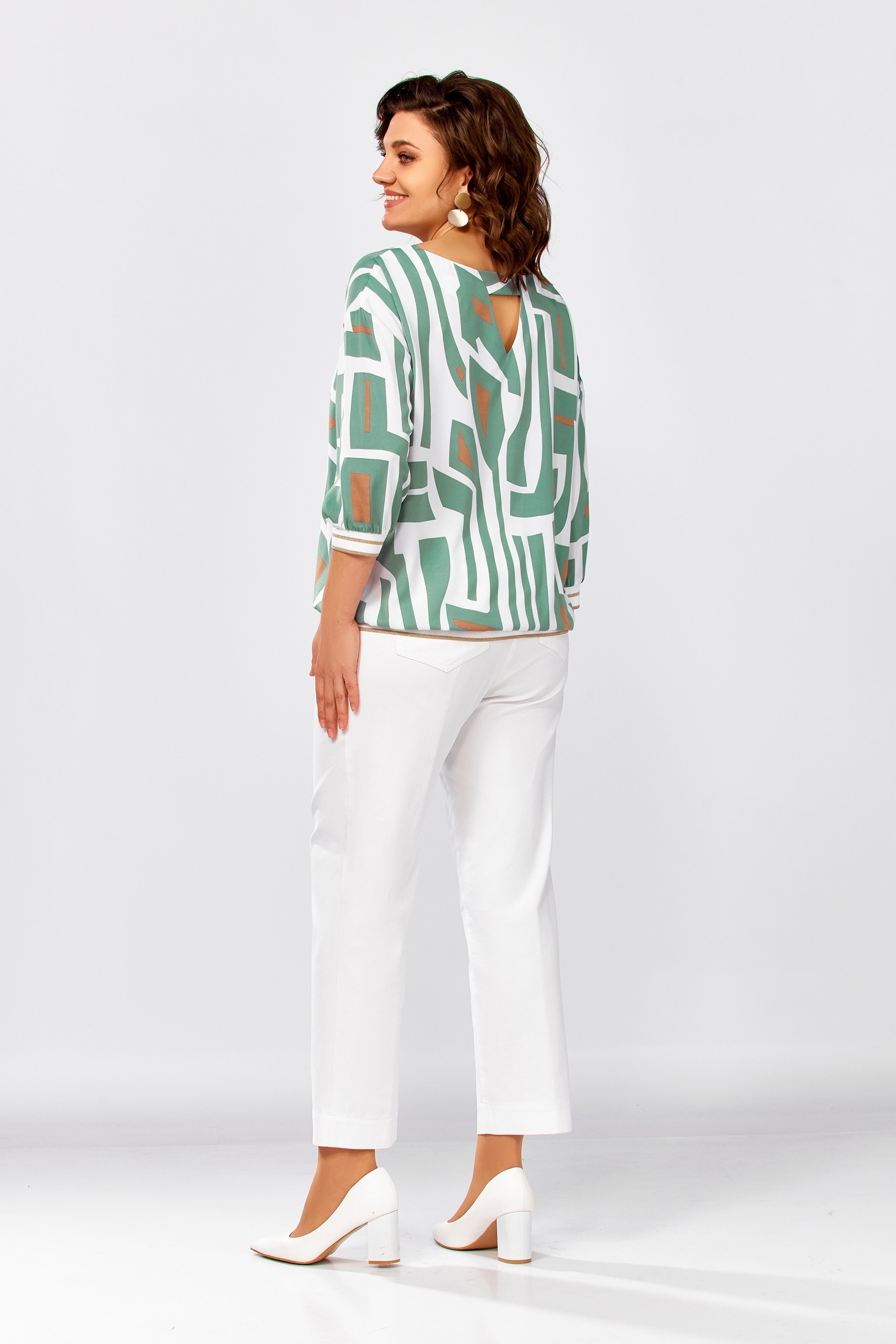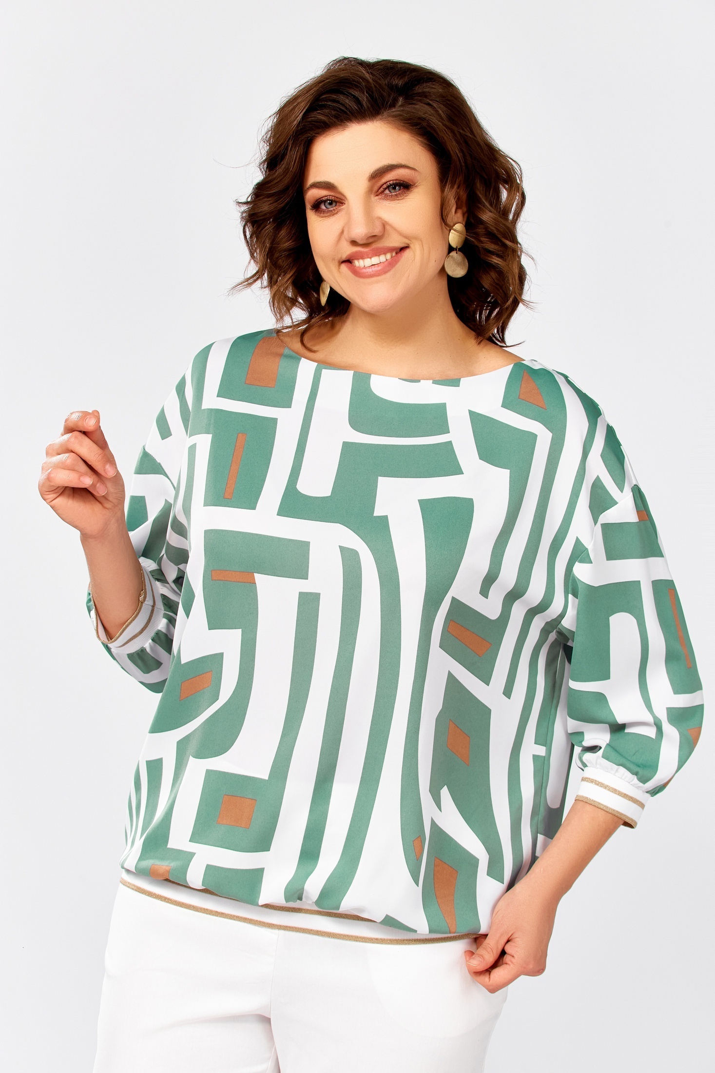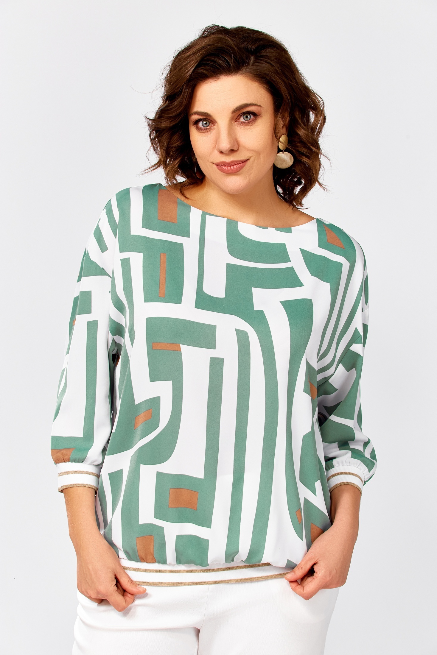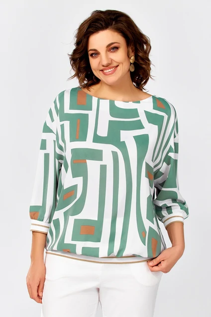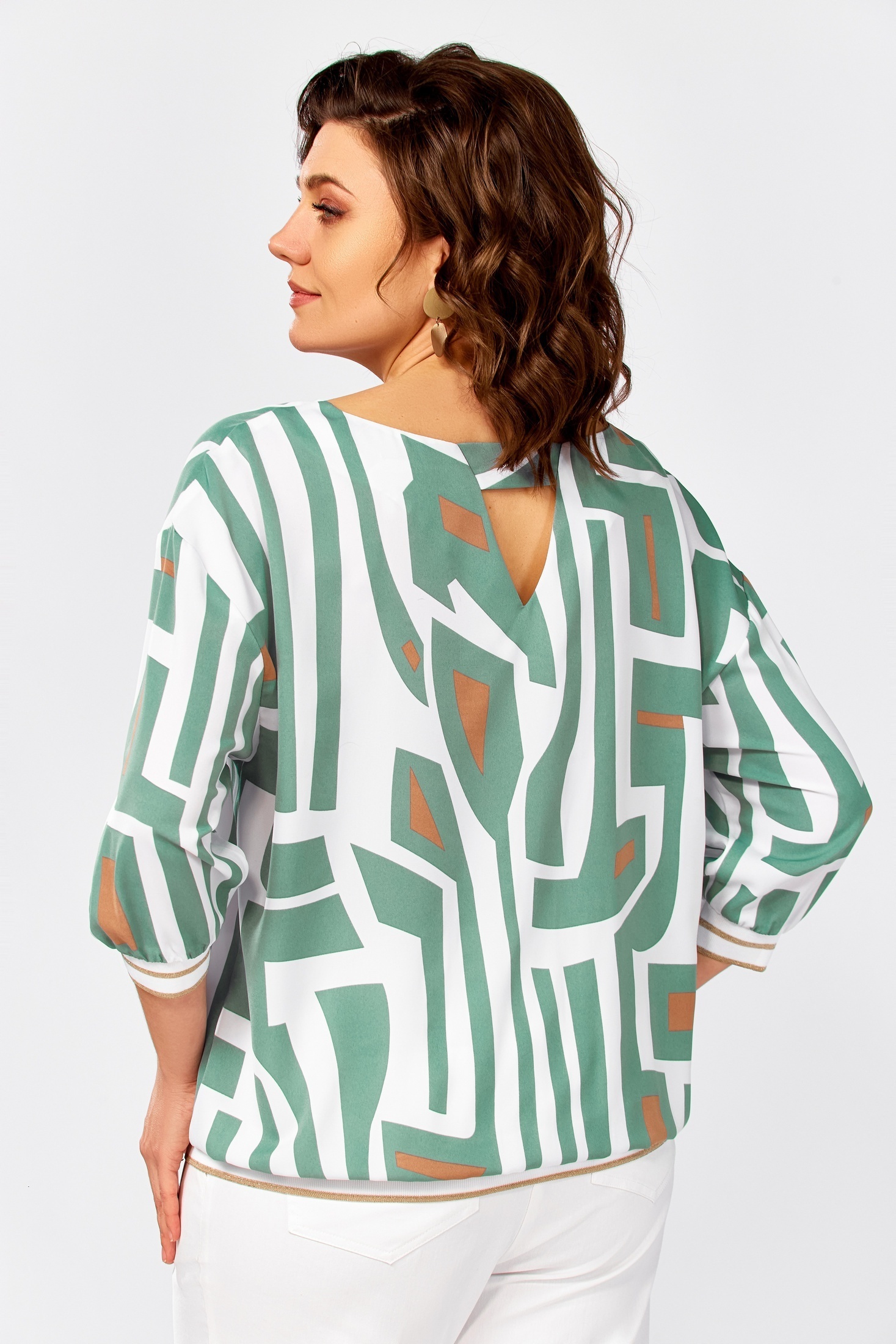 Блузка 872-6 Swallow из коллекции бренда Swallow выполнена из мягкой вискозной ткани, обеспечивающей комфорт и лёгкость. Свободный силуэт со спущенной линией плеч и округлой горловиной по полочке создает непринужденный и стильный образ. V-образный вырез на спинке, соединённый планкой, добавляет нотку оригинальности. Рукава длиной 3/4 оформлены трикотажным довязом, что делает эту блузку универсальной для любых весенне-летних мероприятий. Приятный геометрический принт в зелёных и коричневых тонах подчеркнет ваш индивидуальный стиль. Длина блузки варьируется от 67 до 69 см в зависимости от размера.
