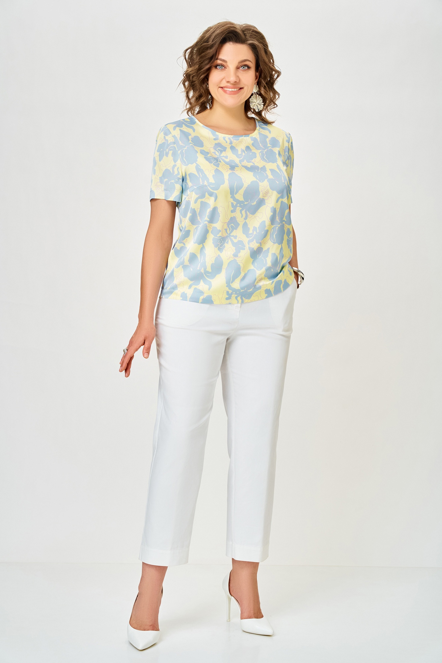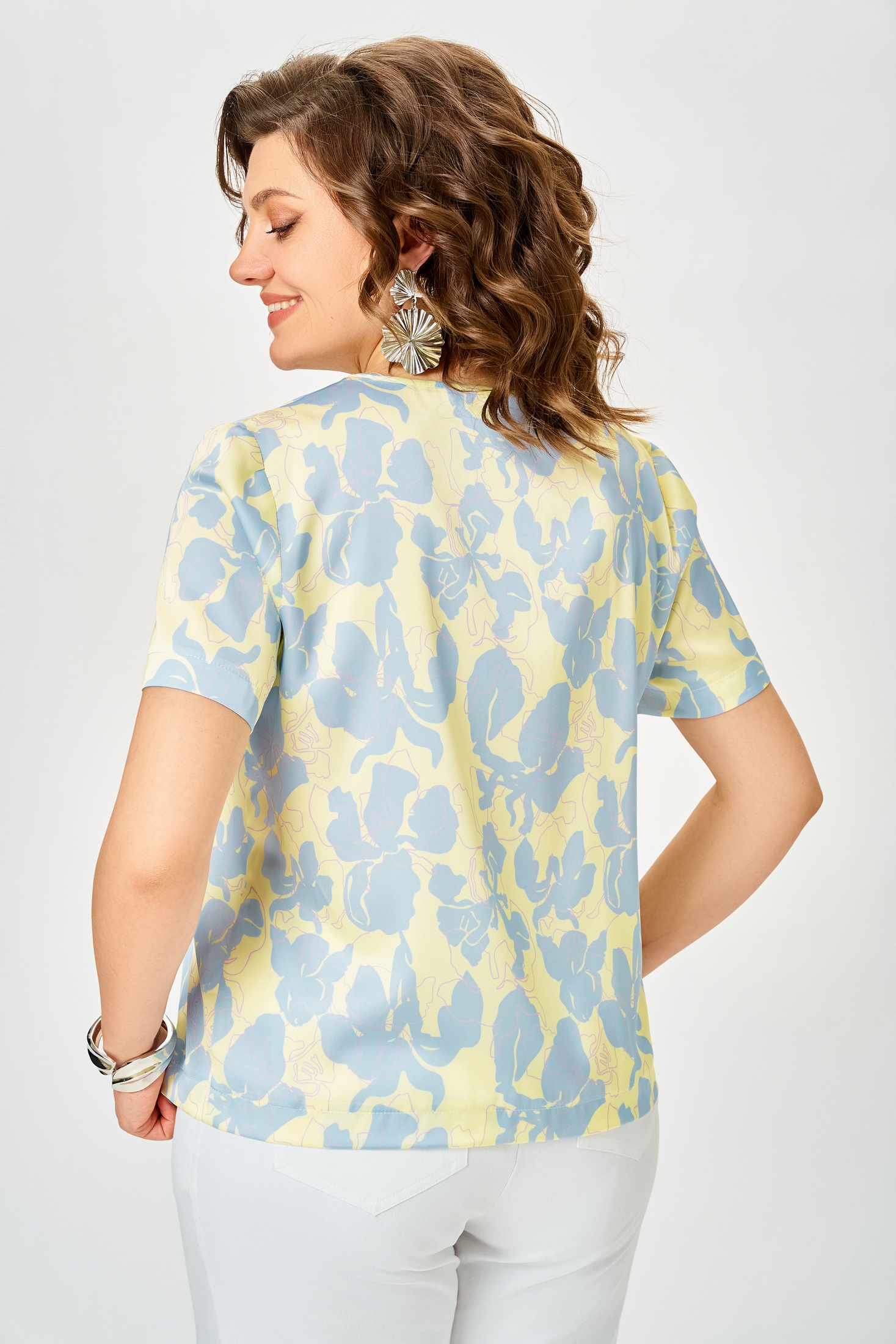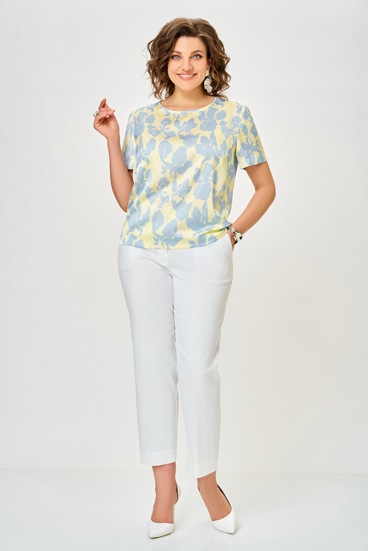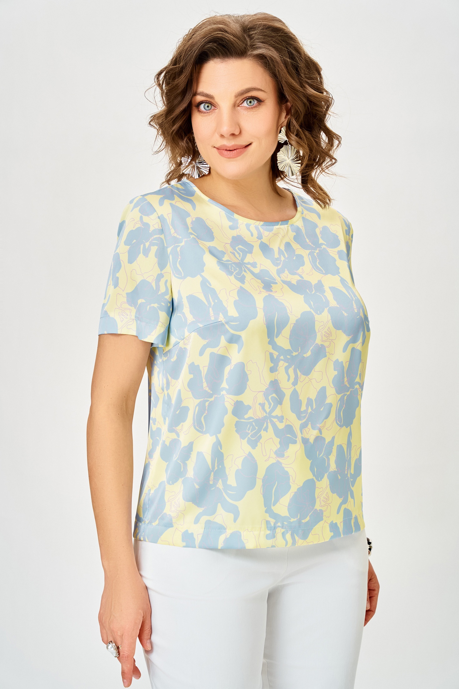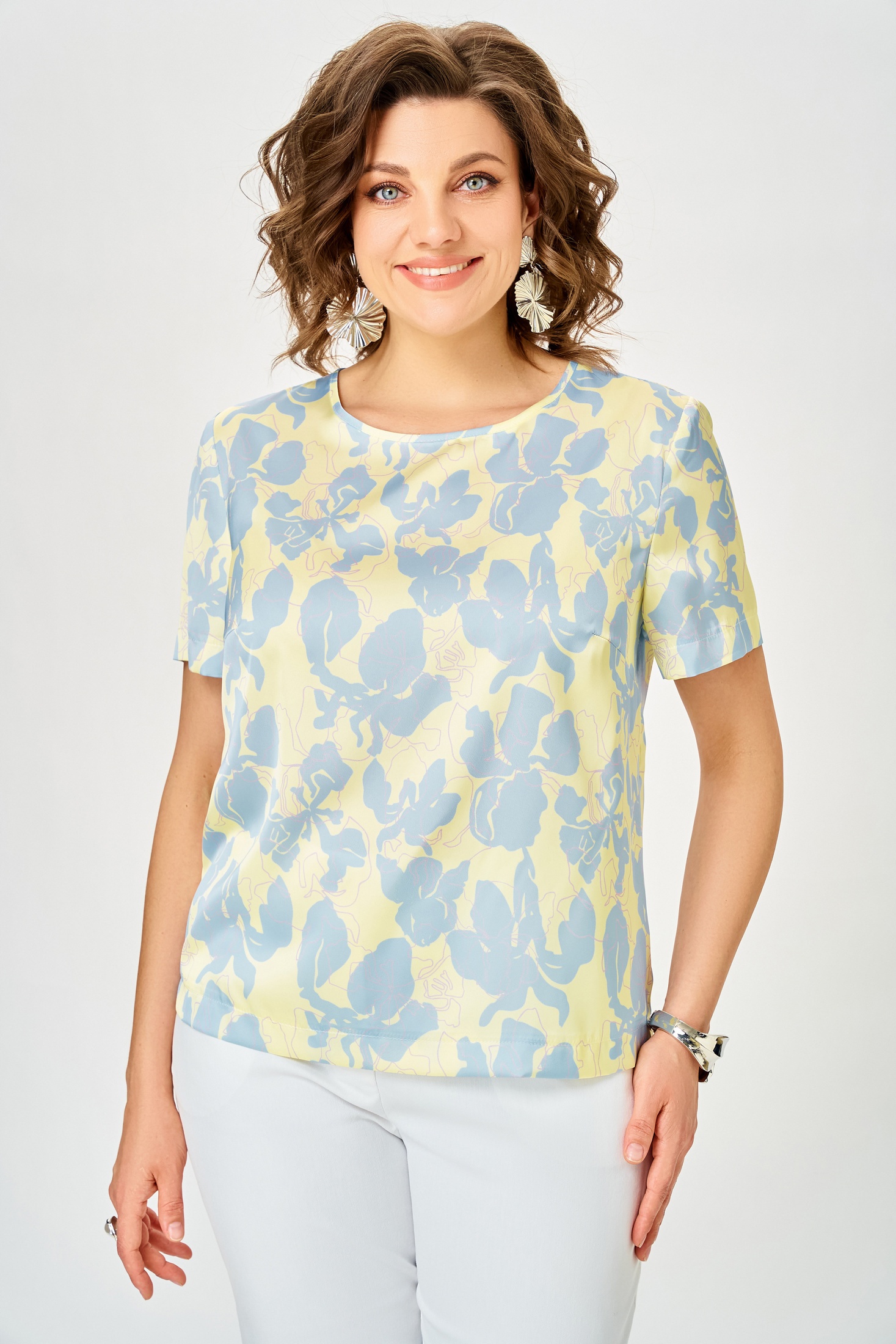 Блузка 917 голубые цветы Swallow — элегантная женская модель из коллекции бренда Swallow. Изготовлена из ткани «Армани», имитирующей шелк, что придаёт изделию мягкость и легкость. Прямой силуэт с нагрудной вытачкой и округлой горловиной создаёт нежный образ. Втачные рукава длиной от 21 до 28 см обеспечивают комфорт в носке. Длина блузы варьируется от 58 до 67 см, что делает её универсальной для различных мероприятий. Основной рисунок в голубых цветах идеально подходит для весны и лета, добавляя свежести вашему гардеробу. Цветочный принт и нежный оттенок делают её подходящей для повседневного и офисного стиля.