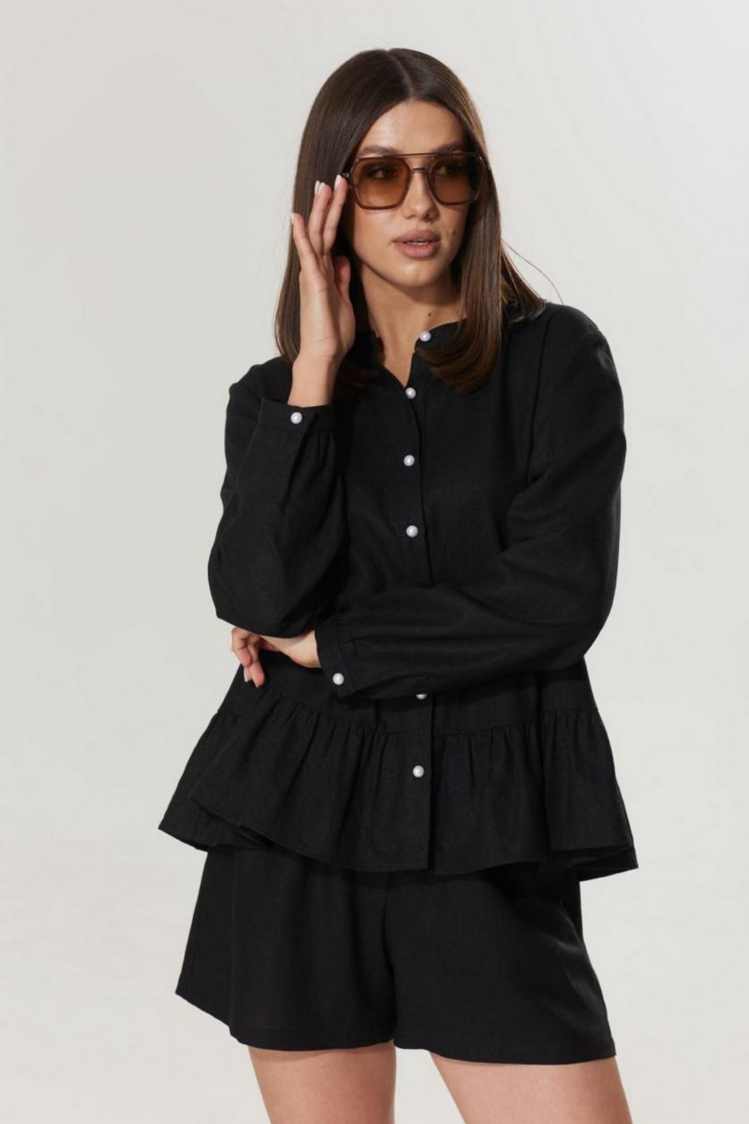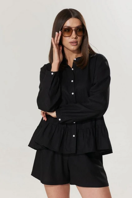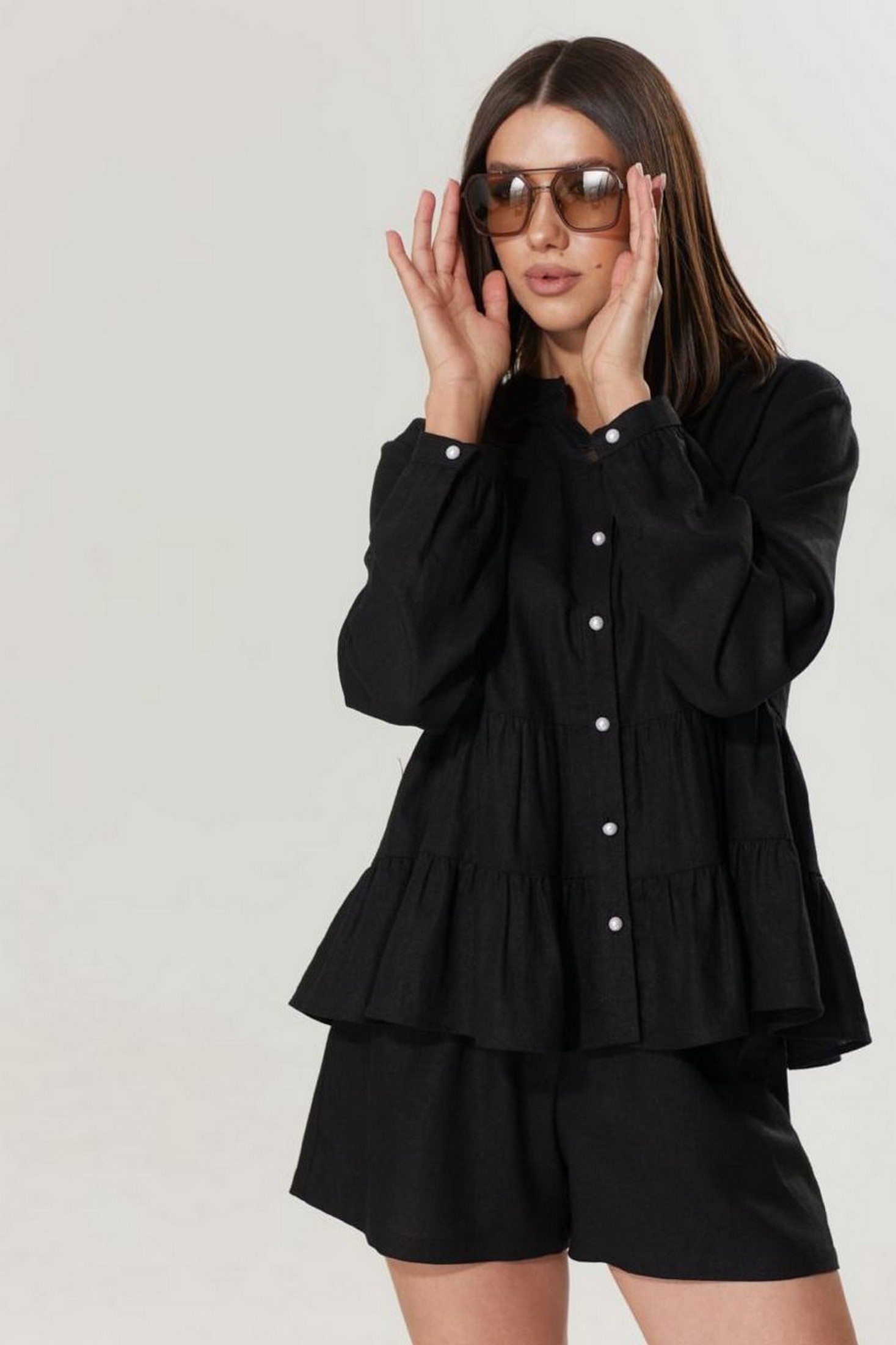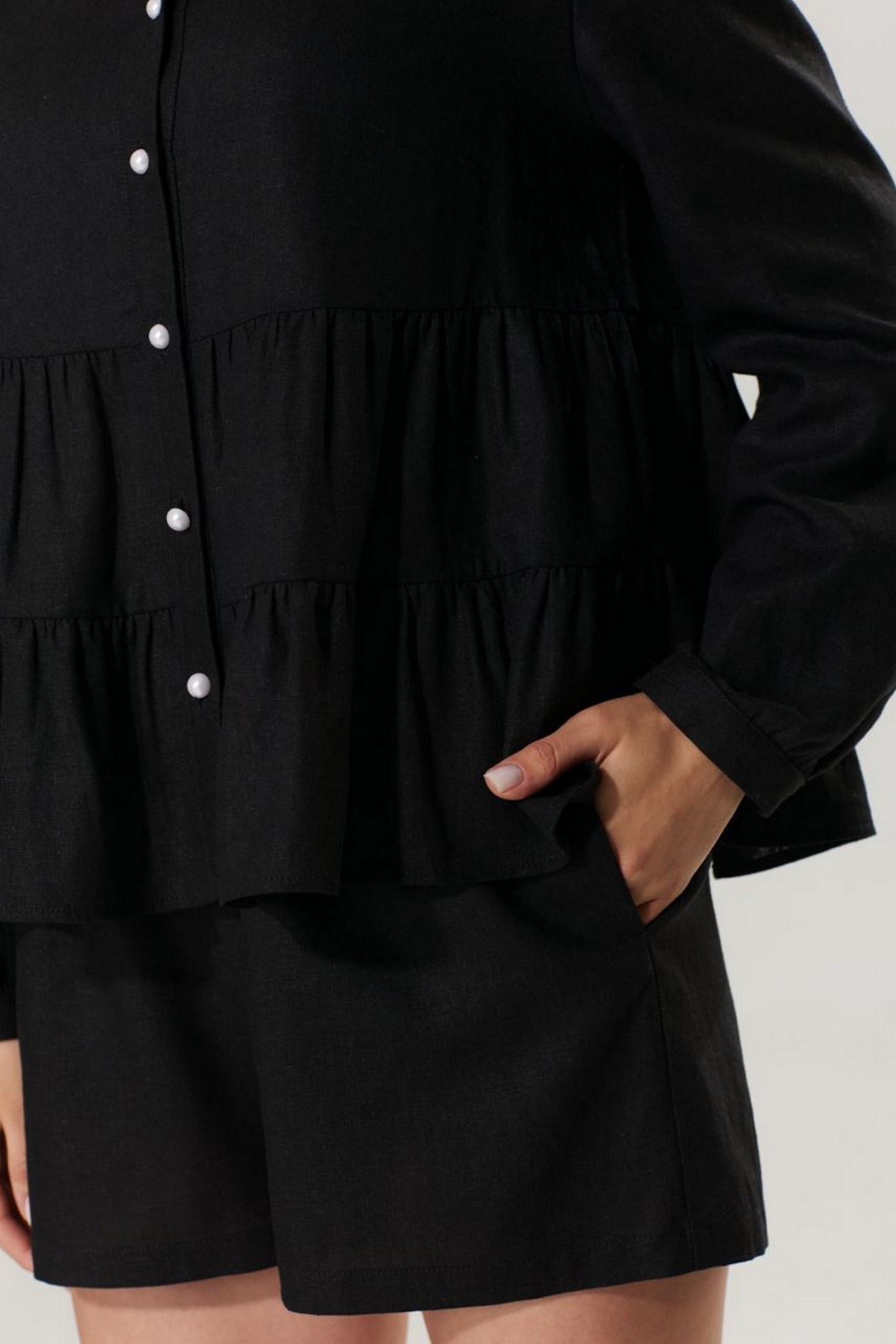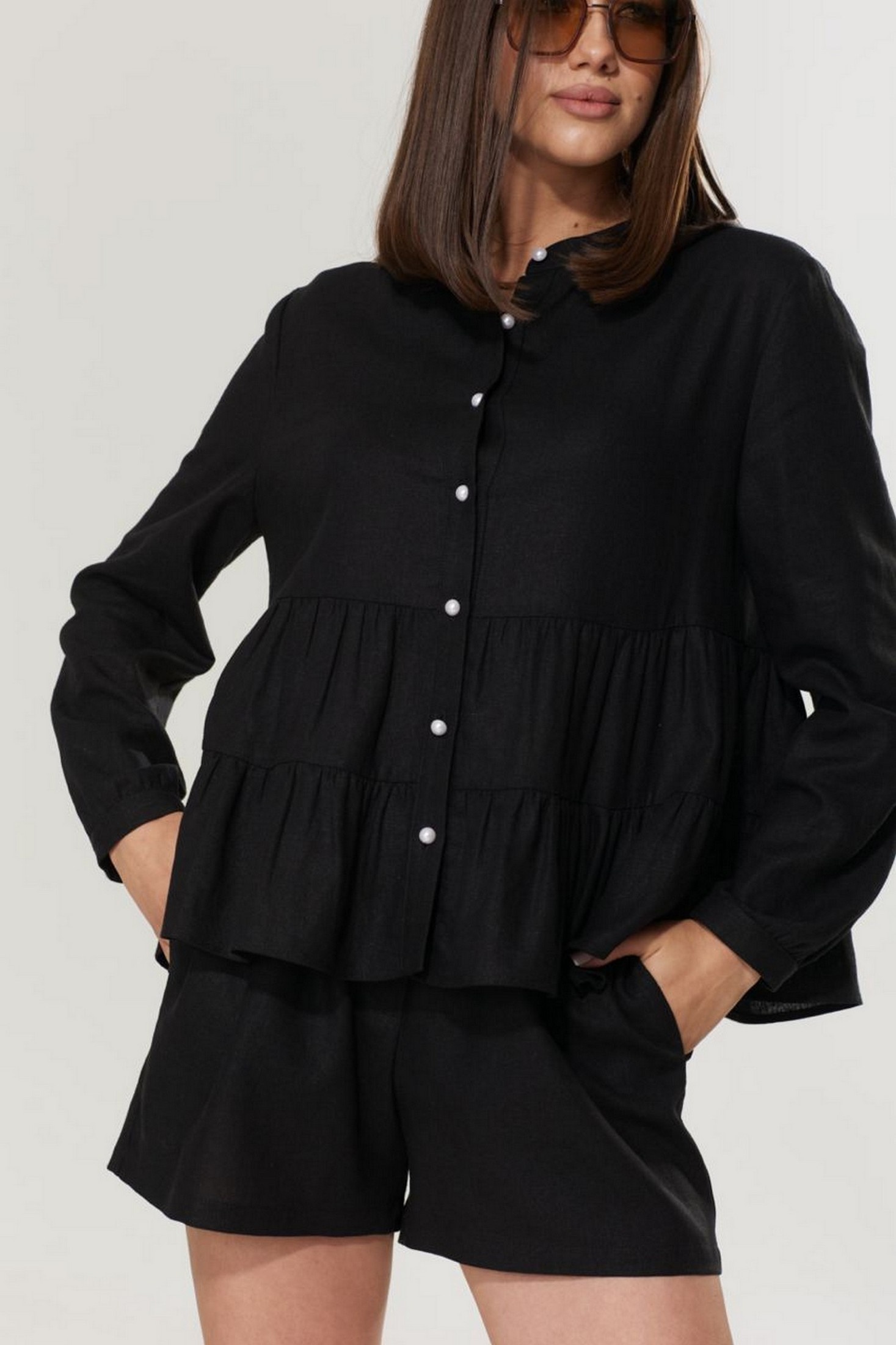 Блузка 119 T.N.D — это идеальный вариант для летнего гардероба. Коллекция бренда T.N.D представляет эту легкую женскую блузку, выполненную из льна с добавлением вискозы. Материал обеспечивает комфорт и дышащие свойства в жаркие дни. Свободный А-образный силуэт и три яруса на сборке добавляют легкости образу. Втачные длинные рукава с присборенным манжетом и центральная застежка на декоративные пуговицы подчеркивают стиль изделия. Округлая горловина с небольшой стойкой создает сдержанный офисный вид, идеально подходящий для деловых встреч и повседневного ношения. Классический черный цвет делает блузку универсальной для комбинации с другим гардеробом.