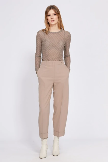 Боди выплонено из эластичной сетки с принтом. Боди приталенного силуэта. Перед и спинка цельные. Горловина округлой формы, обработана бейкой из основной ткани. Рукав втачной, одношовный. Нижняя часть застегивается на тесьму с кнопками.