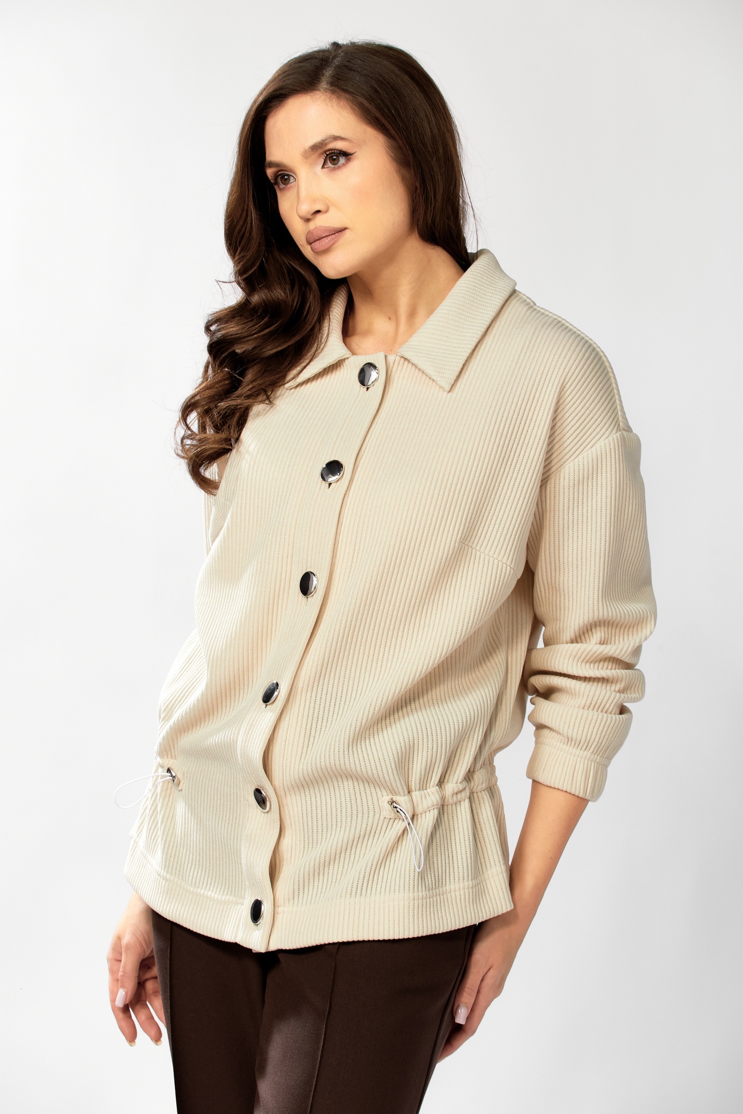 Бомбер 6011-1 KaVari plus size уверенно сочетает в себе стиль и комфорт. Коллекция бренда KaVari предлагает идеальный вариант для демисезонного образа. Изготовлен из 81% полиэстера, 14% вискозы и 5% спандекса, этот бомбер обеспечивает лёгкость и комфорт, адаптируясь к вашему силуэту. Прямой крой с удобными спущенными рукавами, обработанными резинкой, и декоративными элементами на кокетке добавляет изюминку. Застёжка на пуговицах и карман-обманка спереди подчеркивают функциональность. Регулируемая кулиса на талии позволяющая подогнать изделие под индивидуальные формы. Универсальный молочный цвет и защитные элементы делают его идеальным выбором для повседневного гардероба. Длина рукава составляет 75 см, а длина спинки – 66 см.