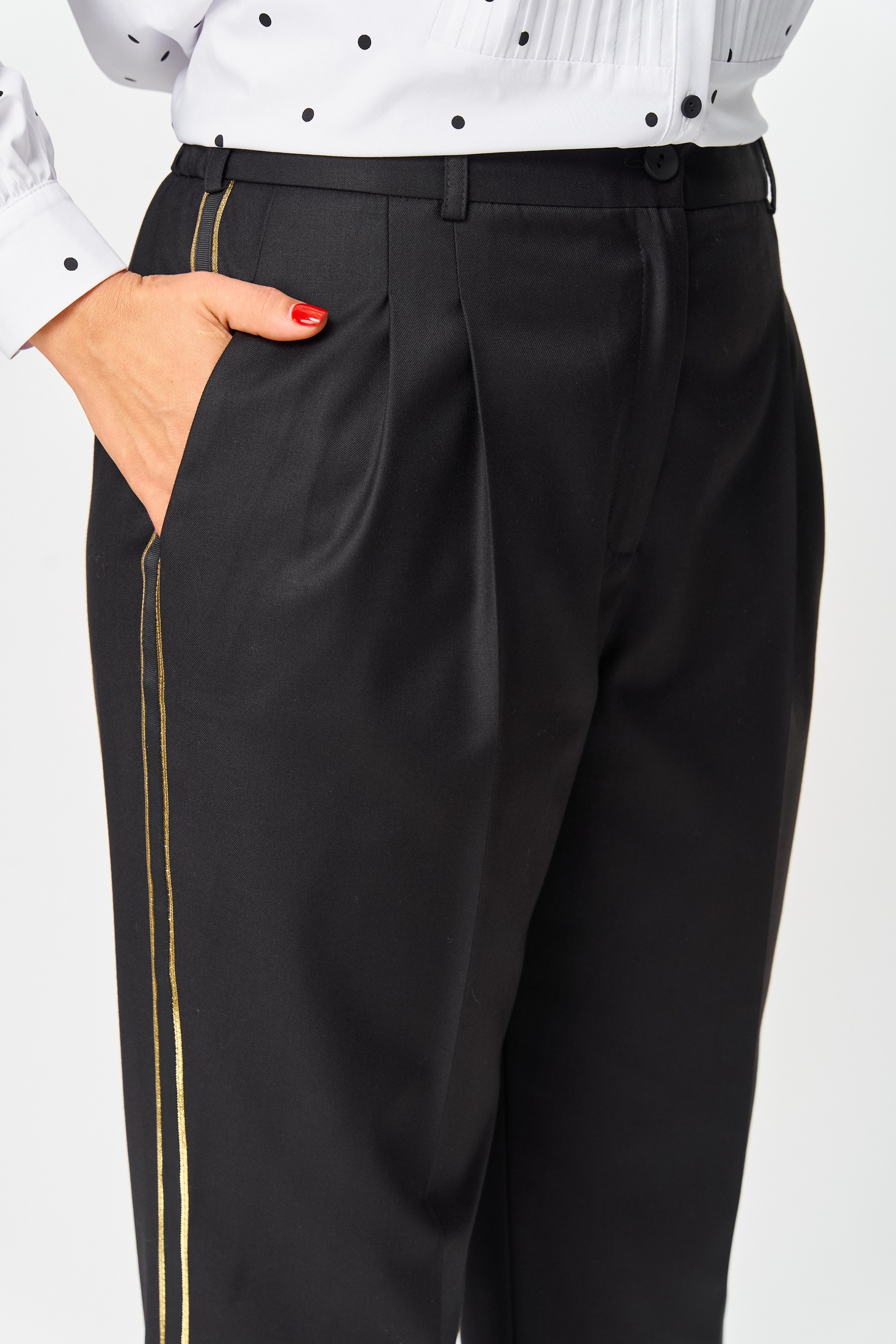 Брюки с высокой посадкой — это лучший выбор для женщин, ищущих комфорт и стиль. Брюки изготовлены из высококачественной поливискозы, они обеспечивают идеальный баланс между удобством и прочностью. Модель с высокой посадкой, с боковыми наклонными карманами, с декоративной тесьмой по боковым швам. Брюки на притачном поясе частично с резинкой.