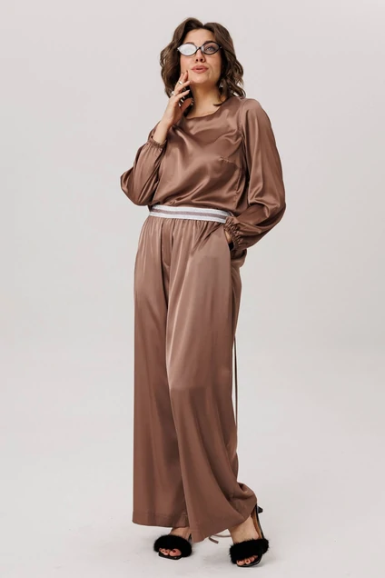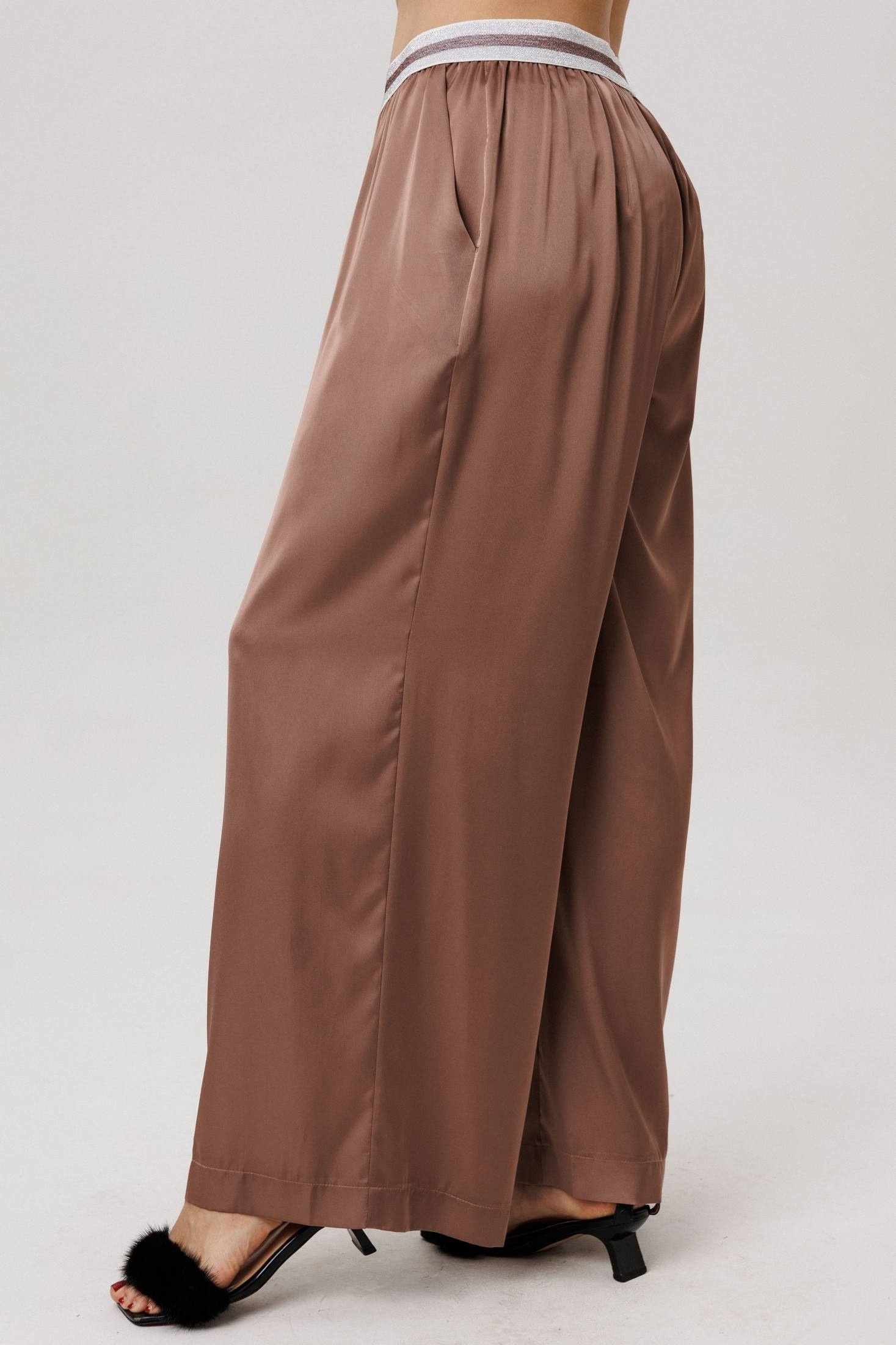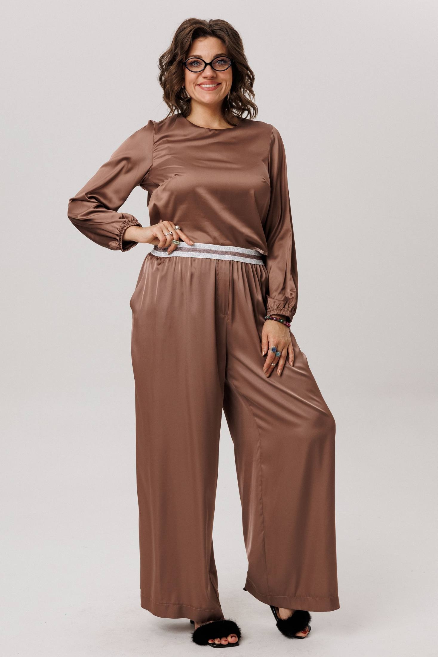 Брюки 1734 карамель Anelli. Эти карамельные брюки из коллекции бренда Анелли выполнены из арманийского шелка, смешанного с вискозой и полиэстером, что придаёт материалу лёгкость и струящуюся текстуру. Широкий фасон и высокая посадка с защипами у талии создают элегантный силуэт, подходящий для праздничных выходов и светских мероприятий. Наличие резинки на поясе и боковых карманов добавляет удобства и функциональности. Брюки идеально подходят для тёплого времени года благодаря своей лёгкости и приятному телу материалу. Их карамельный оттенок добавляет изысканности и стиля в любой образ.