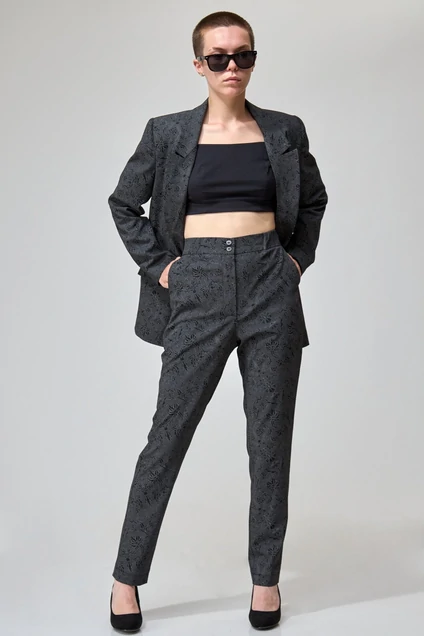 Брюки с высокой посадкой, слегка заужены книзу. Притачной пояс с застежкой на молнию и пуговицу, по боковым - вставка из эластичной тесьмы. На задних половинках - вытачки. В боковых швах расположены функциональные косые карманы. Длина изделия (с поясом): 103 см