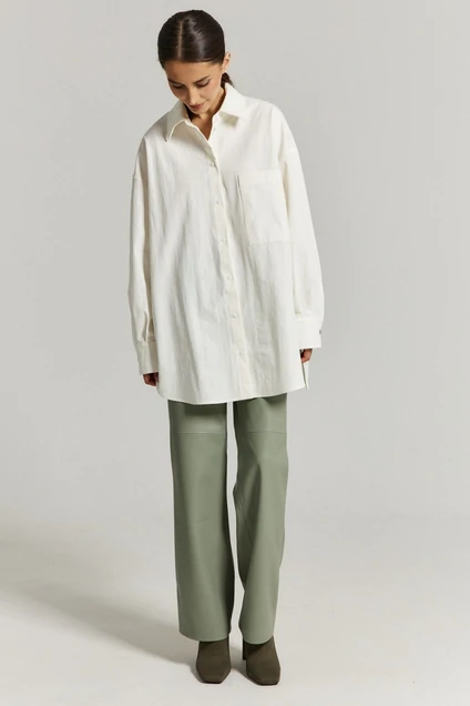 Брюки прямого кроя, выполнены из экокожи в оливковом цвете. Брюки на стабильном поясе, по переду застежка на молнию и пуговицу. По бокам изделия карманы.