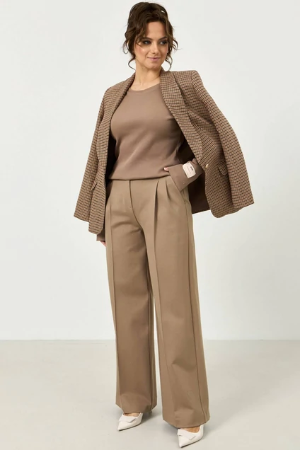 Брюки прямые, на стабильном поясе, по бокам пояса на резинке. По бокам функциональные карманы. Застежка на молнию и пуговицу. Брюки из плотной трикотажной ткани.