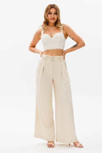 Брюки прямого силуэта, свободного кроя, со складками по линии талии, направленными в сторону бокового шва. По переду гульфик с застёжкой на молнию. Боковые карманы с отрезным бочком. Отрезная кокетка сзади. Накладные карманы на задних половинках брюк. Декоративный пояс из основной ткани с металлической пряжкой. Длина брюк по боковому шву 110 см.