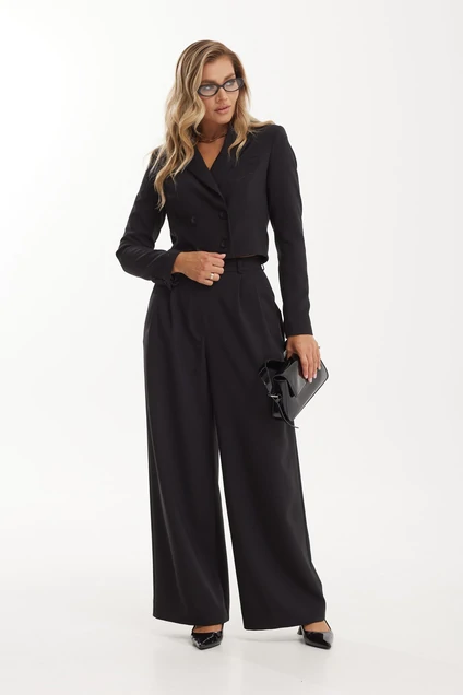 Брюки прямого кроя со складками на талии направленными в сторону бокового кармана. Посадка на талии, верх брюк - притачной пояс со шлёвками для ремня. Карманы с отрезным бочком в боковых швах. Длина по боковому шву 110 см.