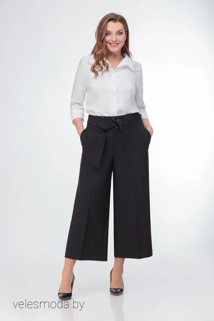 Кюлоты женские широкие, прямые, по среднему шву с застежкой на тесьму-молнию, с притачным поясом-кокеткой, который застегивается на 2 петли и пуговицы. Брюки с наклонными карманами по передним половинкам, с имитацией карманов с листочкой по задним половинкам.