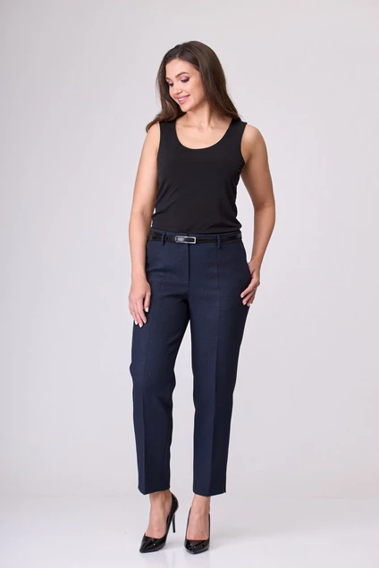 Брюки классические, из плотной текстильной ткани, прямые, слегка заужены к низу, заутюжены стрелки, по переду обработаны карманы с отрезным бочком, застежка на тесьму-молнию и 1 пуговицу. На задних половинках обработаны вытачки и имитация карманов в рамку с двумя обтачками, пояс в брюках притачной. По низу брюк в боковом шве есть небольшой разрез. Длина брюк от талии по боковому шву 96 см.